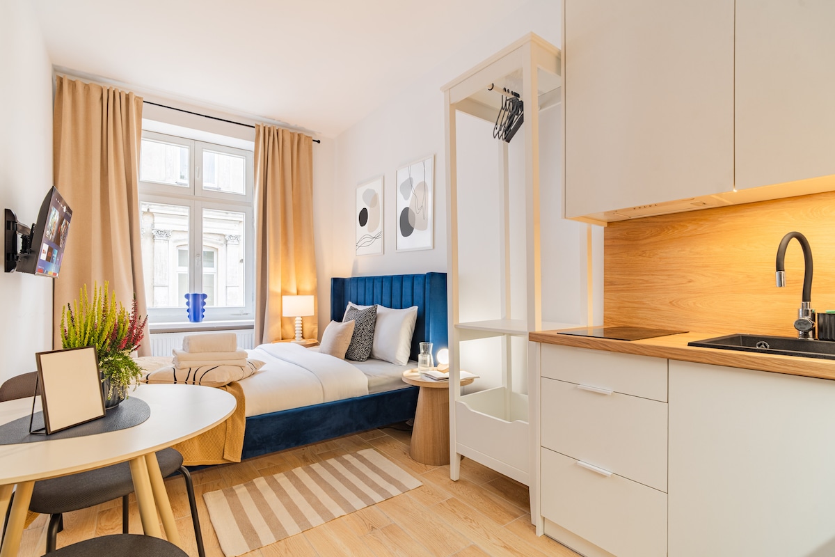 Vakker, ny leilighet i en lukket eiendom i Queen Bona Gardens i sentrum av Gliwice, ul. Górnych Wałów 23C, med innsjekking uten vert. Markedsplassen ligger fem minutter unna, og Gliwice Arena ligger 20 minutters gange unna. På høyre side av boligen ligger katedralen Peter og Paul. Leiligheten er utstyrt med de nødvendige apparatene: vaskemaskin, oppvaskmaskin, induksjonstopp, mikrobølgeovn, kjøkken, TV med internettilkobling, garasje inkludert. Studio: stue med åpen kjøkkenløsning, bad og balkong.