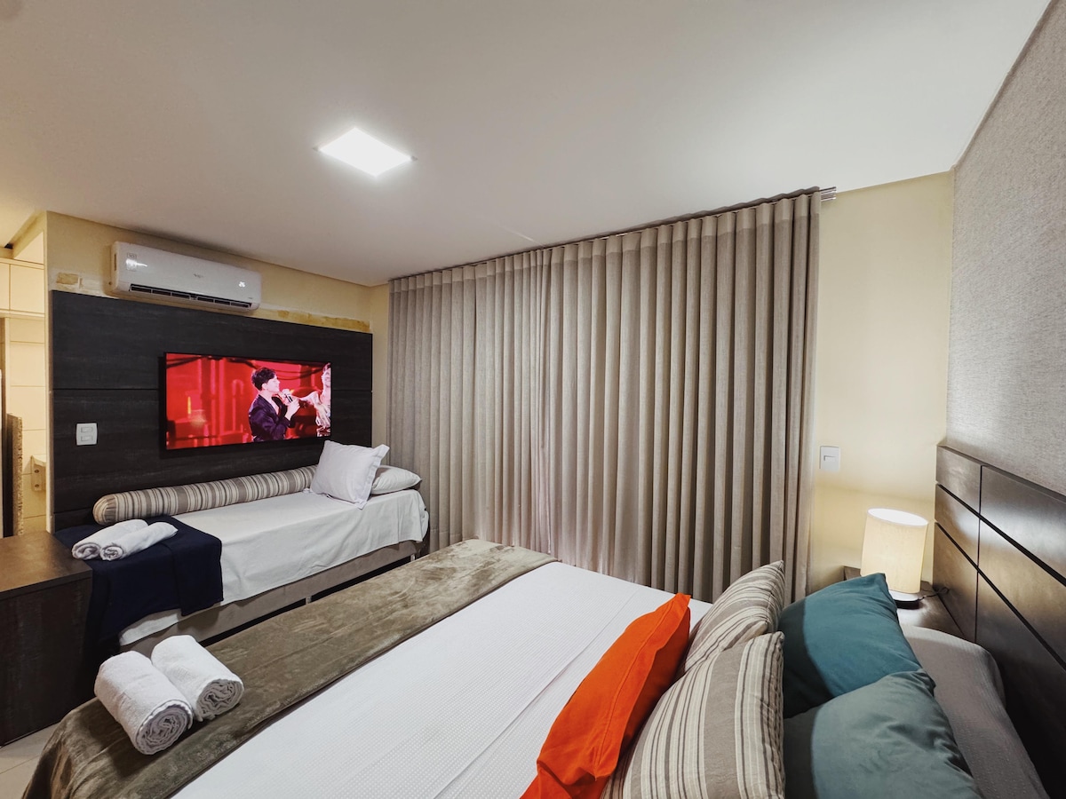 ❗️En unik, elegant og sofistikert ny leilighet🤩, laget for at du skal føle deg som hjemme. Se favorittfilmen din på soverommet eller stuen i den mest moderne smart-TV-en med klimaanlegg. Kle deg i den beste sengen, nyt den varmeste dusjen, nyt balkongen og en vakker utsikt og nyt den moderne Setor Bueno i den beste regionen Goiânia ! Condomínio Tai Residências