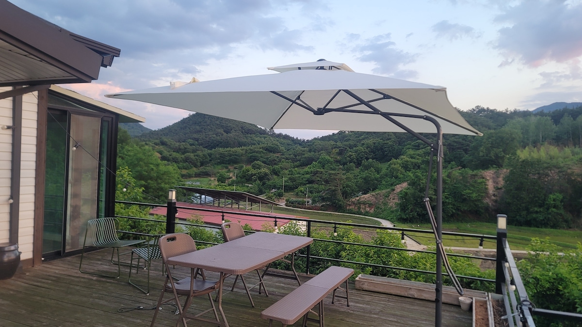 Den er omfavnet av Jirisan-fjellet, og Seomjin-elven ser vakker ut på gården. Det er med gården i den vakre skogen, slik at du kan slappe av i sinn og kropp. Opplev sinnet som tømmes under den stjerneklare nattehimmelen. Damurak-stedet vårt og Belatunori Farm ønsker å skape en "tur for å ta vare på planeten". I mellomtiden, hvis utseendet på turen har blitt konsumert og fornøyd, reiser du ikke som en "tømming og omsorgsfull" utsikt over turen som vår generasjon gir for neste generasjon? Turen med "tømming og omsorg" starter med å forenkle mat og minimere søppel. Du kan nå fjerne må-bake fra listen over ting du må gjøre på turen din. På gården og boligen vår, hvorfor ikke tømme kropp og sinn lett, og ta vare på naturen og opplevelsen av å bli et? Når reservasjonen er bekreftet, kan du kontakte oss direkte på SMS eller telefon. Det er fordi Airbnb Talk har en tendens til å unnlate å gi klare varsler.
