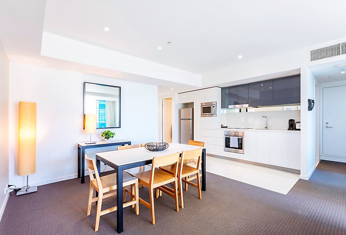 • Beliggenhet! Beliggenhet! Beliggenhet! Beliggende i hjertet av Surfers Paradise, et toppvalg for ferien din! • Som gjest har du GRATIS tilgang til alle de samme fasilitetene - utendørs basseng, oppvarmet innendørsbasseng, innendørs boblebad, badstue, 2 GYMs og grillområde som Hilton hotellgjester. • Denne Deluxe Residence med to soverom og to bad i 43. eller 47. etasje tilbyr fantastisk utsikt over himmelen og havet i Surfers Paradise fra balkongen eller gjennom panoramavinduene.