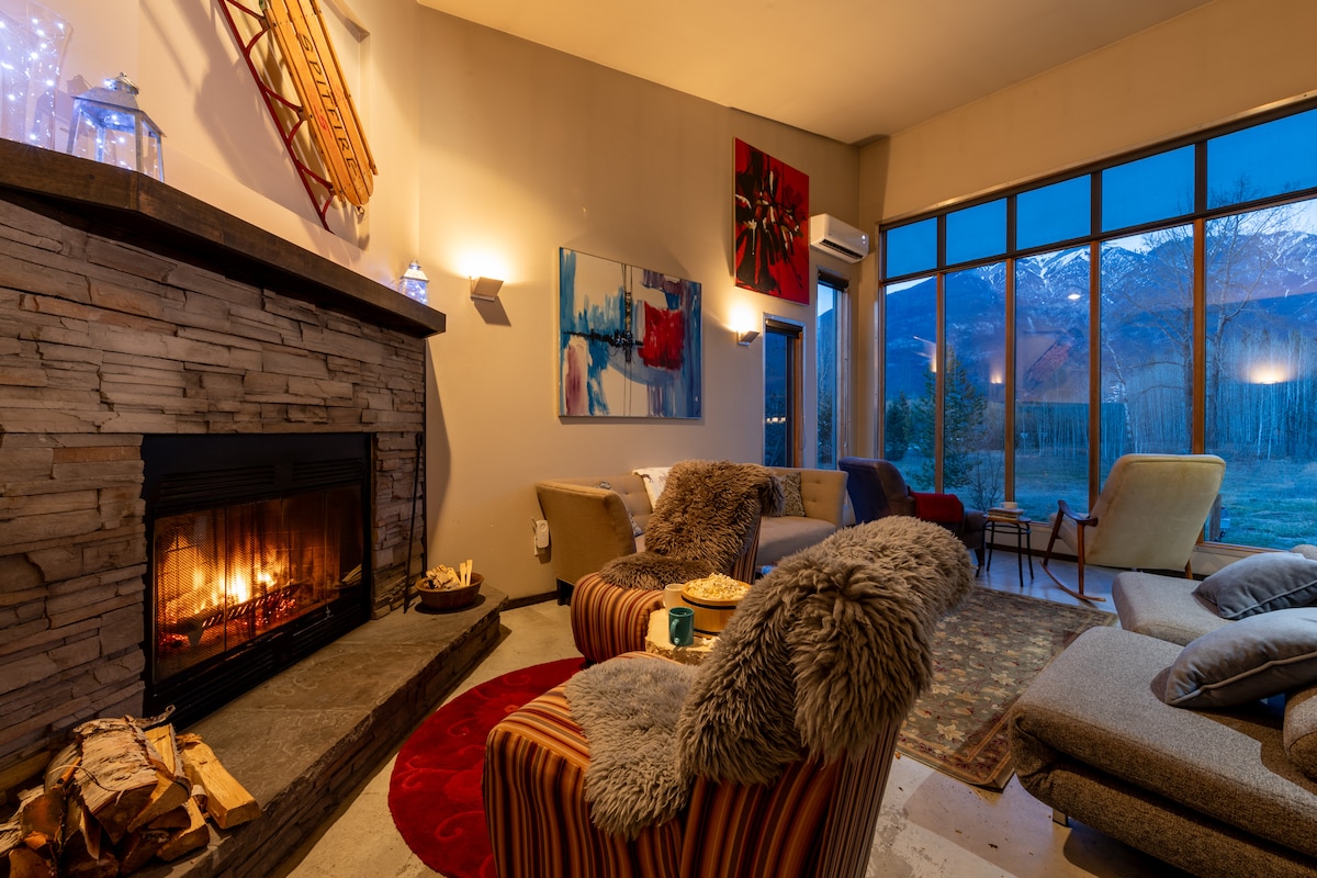 Denne nybygde hytta er designet for å nyte utsikten over fjellet! Lys og luftig, med moderne fasiliteter og rustikke detaljer. Hvert vindu har imponerende topper, en vakker fjelleng med beitende hester og Purcell-fjellene i bakgrunnen. Perfekt for to par eller en liten familie. Bare minutter fra Goldens nyeste attraksjon, «Skybridge», og en enkel kjøretur til Kicking Horse Mountain Resort og fire nasjonalparker. Perfekt base for alle fjelleventyrene dine.