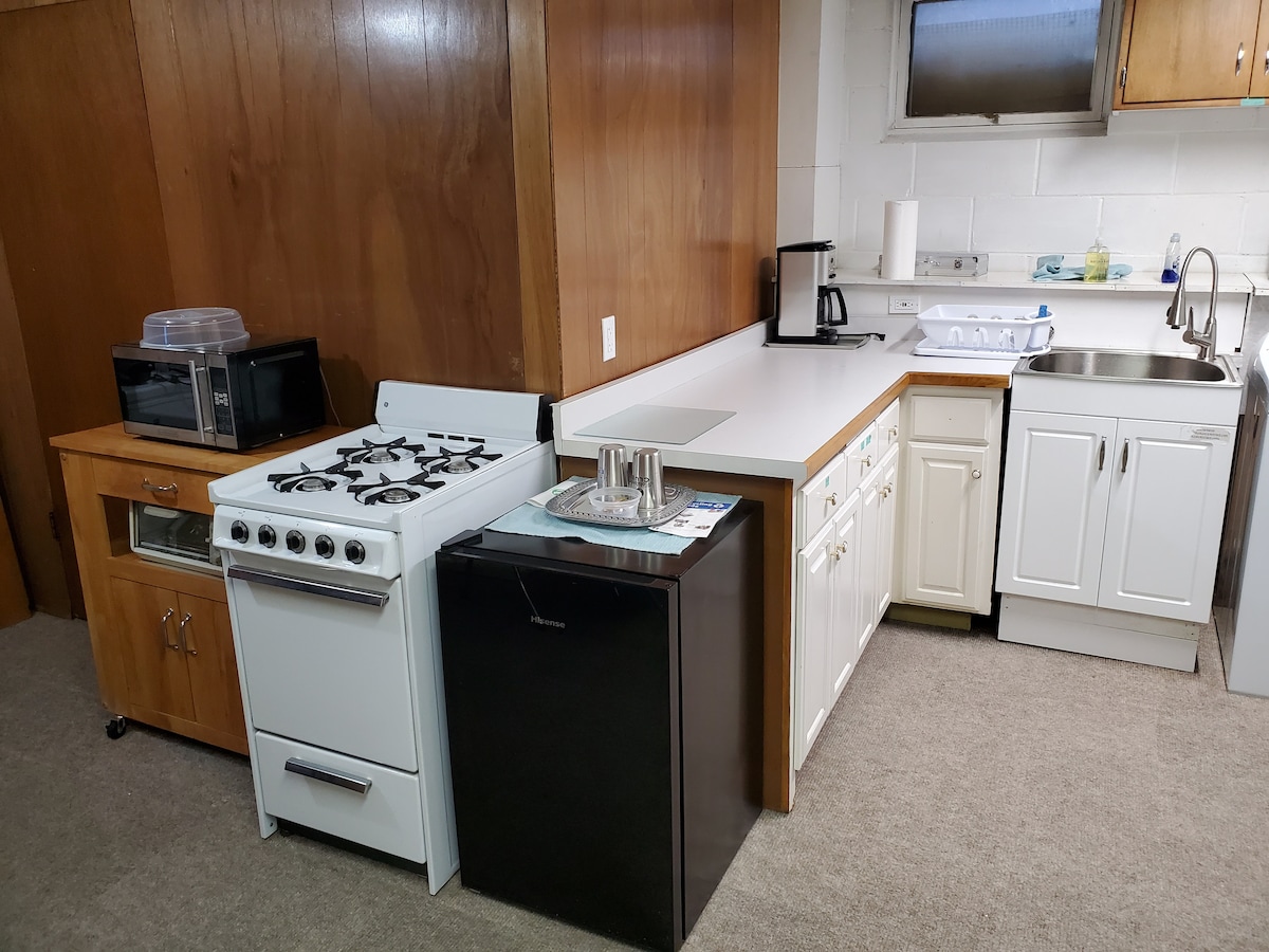 For din fornøyelse er det en ren leilighet med ett soverom i hjemmet mitt. Den har en privat inngang, reservert parkering, et luksuriøst bad med et dypt badekar og et fullt utstyrt kjøkken. På soverommet er det en king size-seng og en smart-TV koblet til internett for bruk. Hjemmet ligger på en blindvei i et rolig nabolag som ligger i nærheten av alt. Innenfor kvartaler av huset er det restauranter, butikker og flere dagligvarebutikker.