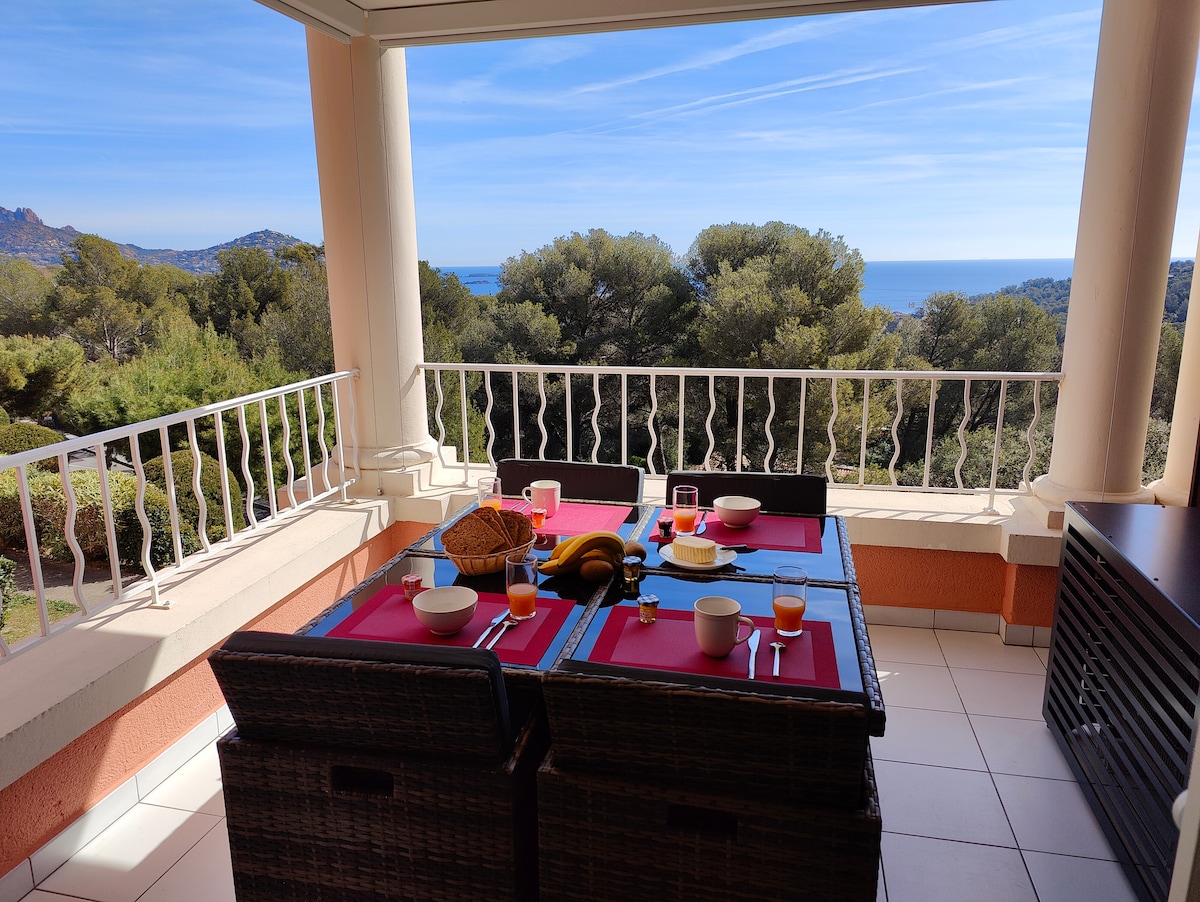 Leilighet med aircondition for fire personer, med egen inngang og parkering i en villa. Nyt et privat saltvannsbasseng, stille og utenfor synsvinkel. To soverom, bad, utstyrt tekjøkken. Sikker parkering med elbillader (valgfritt). Frokost tilgjengelig. Perfekt base for å utforske Saint-Raphaël, Saint-Tropez, Cannes, Nice og Monaco.