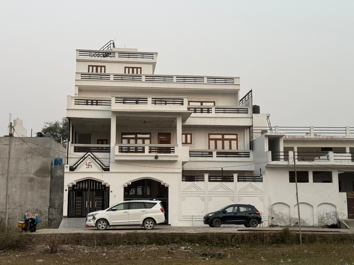 Velkommen til den koselige toppleiligheten vår i andre etasje, med privat inngang og en sjarmerende terrasse. Hjemmet tilbyr to soverom med aircondition, hvert med en kingsize-seng, to bad (ett tilknyttet, ett i stuen), et kjøkken med RO-vannfilter og et lite fellesområde med kjøleskap. Det tilbys også høyhastighets Airtel trådløst nettverk og et skrivebord. Vær oppmerksom på at hvis du bestiller for 1–2 gjester, vil ett soverom og bad forbli stengt for en mer skreddersydd opplevelse.