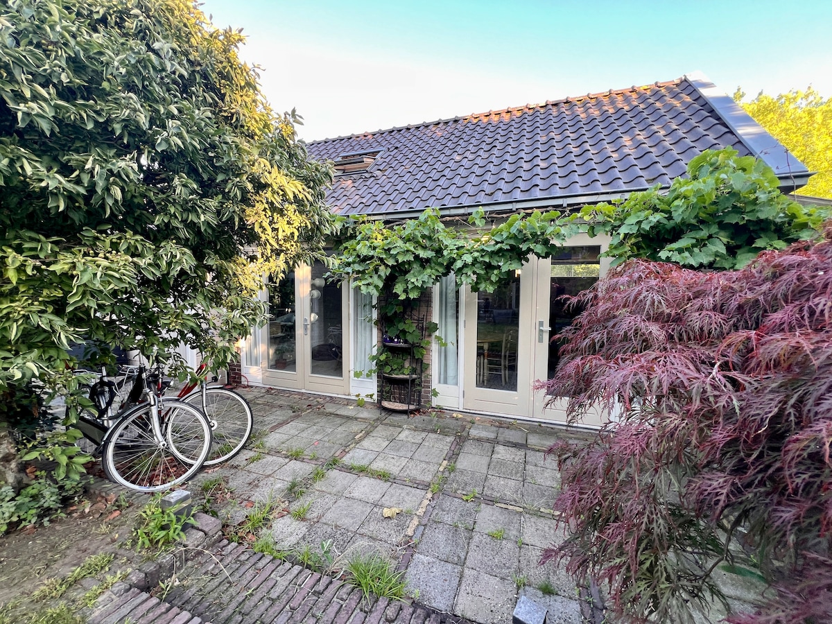 Vi tilbyr deg vårt lyse og komfortable hagestudio. Den har et soverom ovenpå, stue med sovesofa, kjøkkenkrok og bad med toalett/vask/dusj. To sykler er tilgjengelige hvis du gir meg beskjed på forhånd, og vaskemaskin/tørketrommel er tilgjengelig. Nær Hei, natur, teater t Spant, Naarden Vesting. Amsterdam, Utrecht, Hilversum eller Amersfoort ligger bare 20/30 minutter unna med tog.
