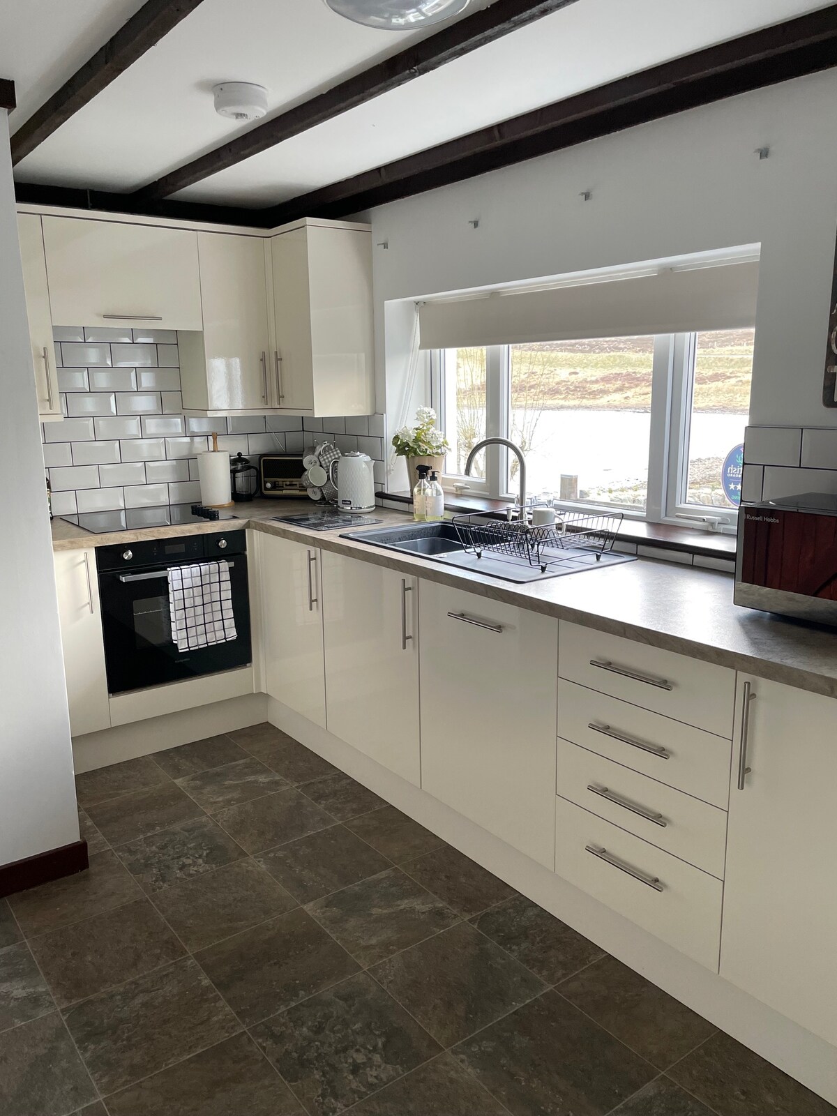 Gael er en moderne hytte på en fungerende torv, som fanger uavbrutt utsikt over Portree-bukten, Ben Tianavaig og Cuillin-åsene i det fjerne. Selve hytta har en full høyde atrium som inkluderer en funksjonell kjøkkenkrok, sitteplass, tømmerbrenner og en tredelt bad. Mezzaninplanet er tilgjengelig med en tretrapp med en komfortabel dobbeltseng Beliggende like ved Scorrybreach-stien er dette den perfekte lanseringsplassen for Skye-eventyret ditt.