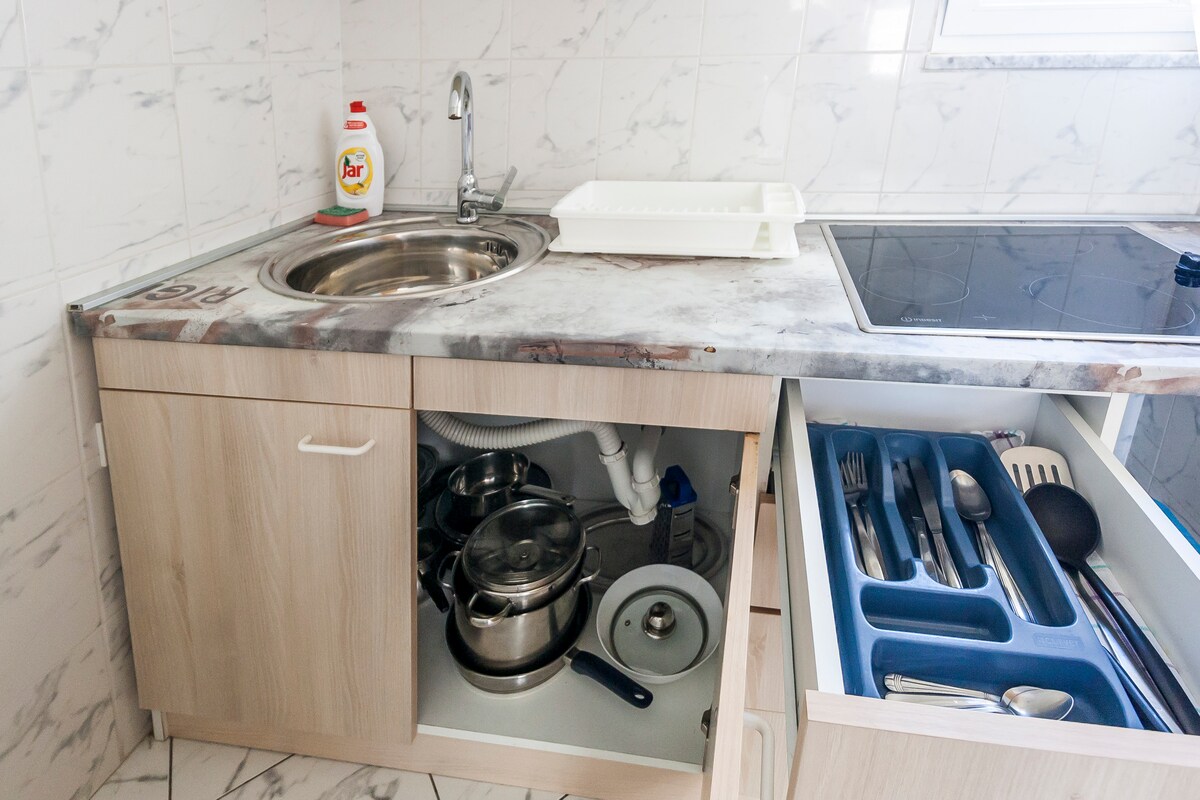 Helt ny og moderne leilighet, fullstendig utstyrt, med to terrasser (den ene ligger alltid i skyggen ), fem minutters gange fra nærmeste strand ( 250 m ), 10-15 minutter ( 650 m ) fra gamlebyens sentrum og markeder. Veldig egnet for familier, veldig trygg og rolig beliggenhet.