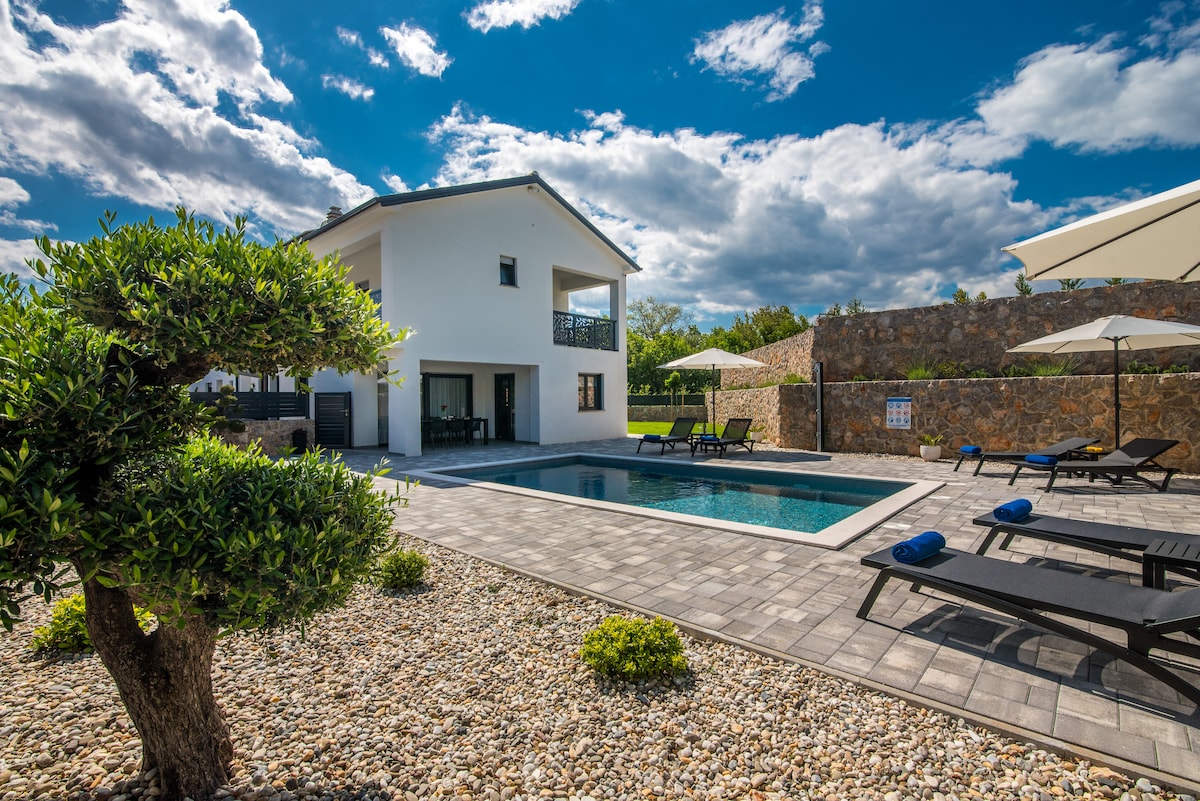 Denne unike, nybygde boligen ligger i landsbyen Vrh på øya Krk, fem km fra gamlebyen og alle nødvendige fasiliteter. Det tilbyr den perfekte oasen for hvile og avslapning i en romslig villa utstyrt med alle fasilitetene som trengs for en uforglemmelig ferie. Villaen har seks moderne innredede rom og plass til tolv personer. Villaen har utsikt over Velebit, det grønne i skogen og havet kan sees fra to rom. Den er egnet for et opphold året rundt, da den har et innendørsbasseng, en sauna og et boblebad.