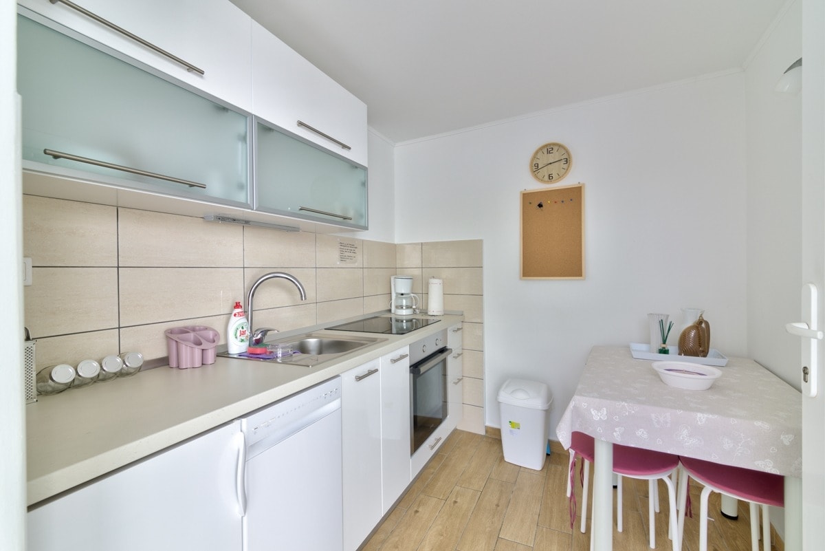 Velkommen til den romslige og lyse leiligheten vår, som ligger rett ved sjøen, ideelt for familier og venner! Leiligheten tilbyr en stue med en komfortabel sofa (egnet for et barn), en spisestue, et fullt utstyrt kjøkken, samt to komfortable soverom, begge med dobbeltsenger. Nyt morgenkaffen din med lyden av bølger, romantiske kvelder med solnedgangen og en fredelig atmosfære som virkelig vil få deg til å slappe av. Leiligheten passer perfekt for opptil fem gjester og gir alt du trenger for et uforglemmelig opphold på kysten.