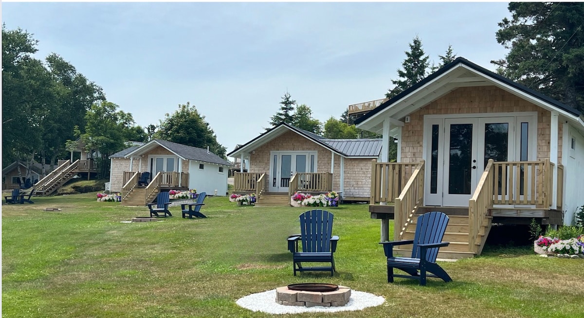 Beach Glass Cottage: Et spa-lignende fristed ved kysten Beach Glass Cottage er inspirert av strendene i Grand Manan, og utstråler spa-lignende sjarm – forestill deg sand, tåke og glass. Denne hytta med åpen planløsning ble bygget sommeren 2022, og har et fullt utstyrt kjøkken, to soverom og et luksuriøst bad. Gå gjennom balkongdørene til en privat terrasse med en seksjonssofa, spisebord, grill og fantastisk utsikt over havet. Denne hytta er familie- og kjæledyrvennlig, og tilbyr gjennomtenkte fasiliteter for et avslappende opphold.