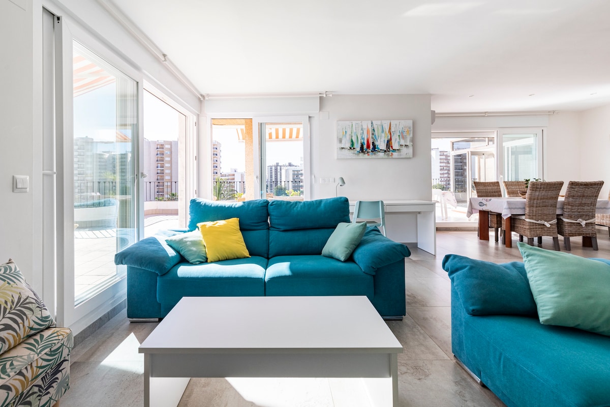 Ático y dúplex con gran terraza privada con vistas al mar. ¡Relájate en nuestro chill-out ! Es un apartamento amplio y reformado. El salón es muy luminoso, con grandes ventanales. Dispone de wifi y ventiladores en todas las habitaciones. Dispone de una plaza de garaje muy cerca del ascensor. La comunidad es una de las más bonitas de Gandía por su enorme jardín y gran su piscina de agua salada. Si tienes niños, les encantará pasar un rato en los columpios o jugando en el jardín. (Solo familias)