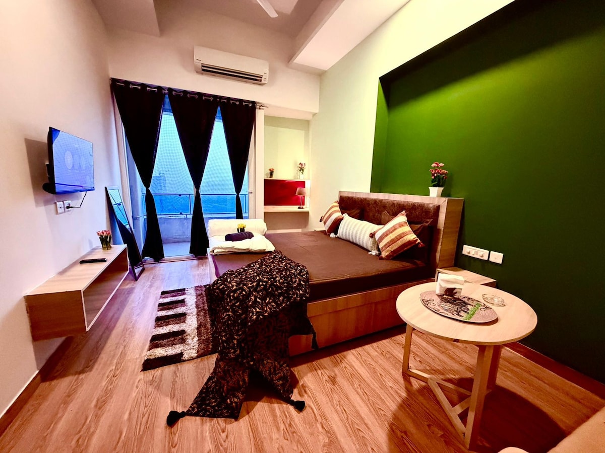 Det beste stedet for PAR og FAMILIER, REISENDE Hel privat studioleilighet i nærheten av Expo Mart Greater Noida. Alle fasiliteter er tilgjengelige, som klimaanlegg, mikrobølgeovn, induksjon, vannkoker, kjøleskap, rask 5G-trådløst nettverk og smart-TV. Rommet har fullt møblerte nye, plettfrie møbler og drømmebelysning som du kan kontrollere som du vil. Den grønne, brede balkongen har en spisestue med utsikt over byens silhuett.
