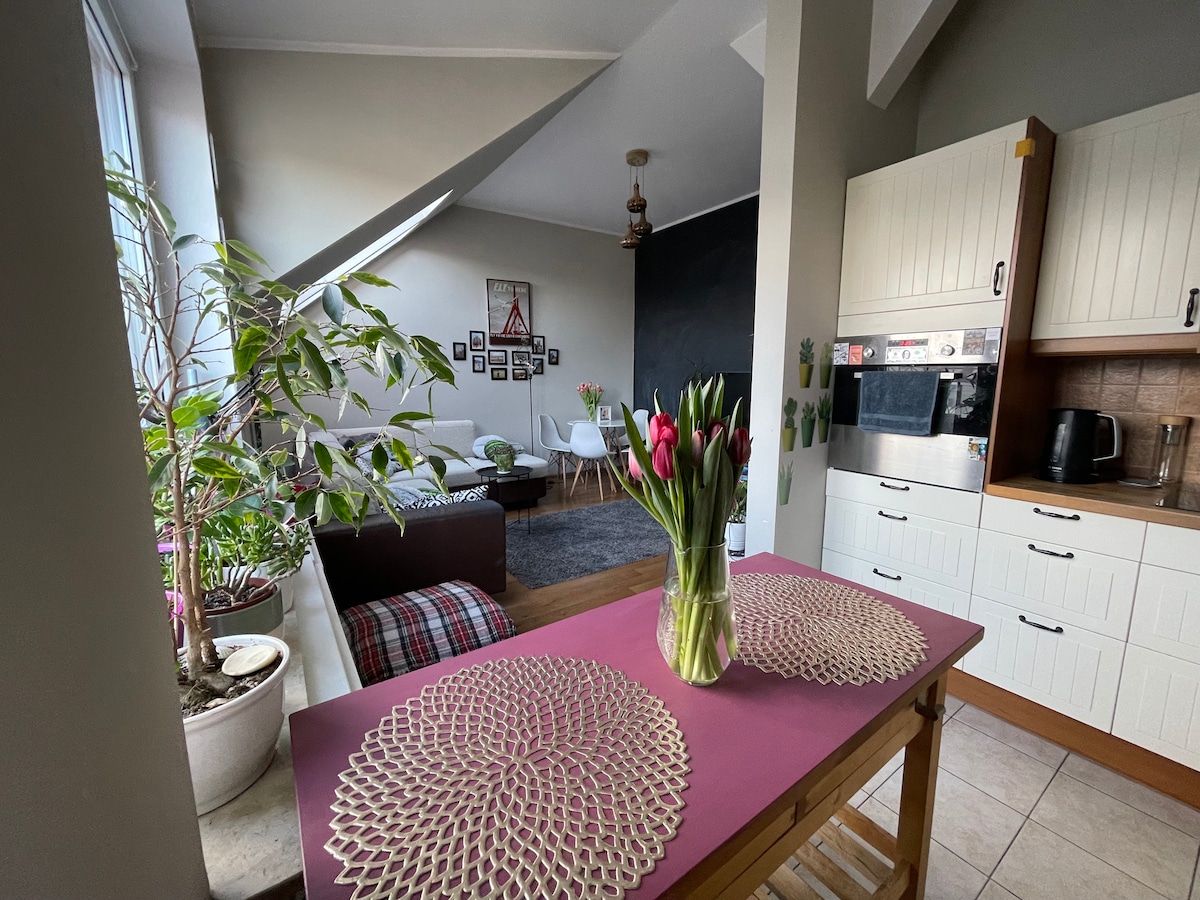 Flott leilighet i loftsstil i nyrenovert historisk bryggeri nær sentrum av Wroclaw, syv minutter med trikk til torget og Ostrow Tumski, katedralen. Trikkholdeplassen ligger over gaten. Bryggeriet ligger ved elven Odra, sykkelfelt, strandbarer, kafeer, bakerier. Første etasje/heisbygning, kjøkken med stue, stort soverom med kingsize-seng, historiske vinduer, murvegger, privat terrasse. Gratis parkering tilgjengelig i komplekset, kjøkkenutstyr, TV, trådløst nettverk, håndklær, hårføner, arbeidsplass, uttrekkbar sofa.