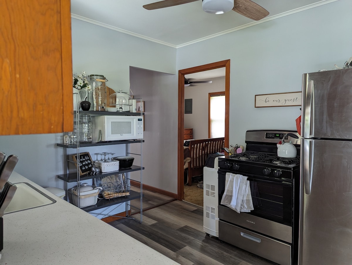 Located on a quiet country road, our quaint little cottage is a lovely place to unwind, make memories, and embrace the simpler life. Featuring an open concept first floor with a cozy living space, an electric fireplace, and a well stocked kitchen. We have been working hard to create a comfortable and inviting atmosphere. Important: the cottage is located next to our home on 5 acres, if you are looking for seclusion, keep looking. We are a large work at home family. You will see and hear us.