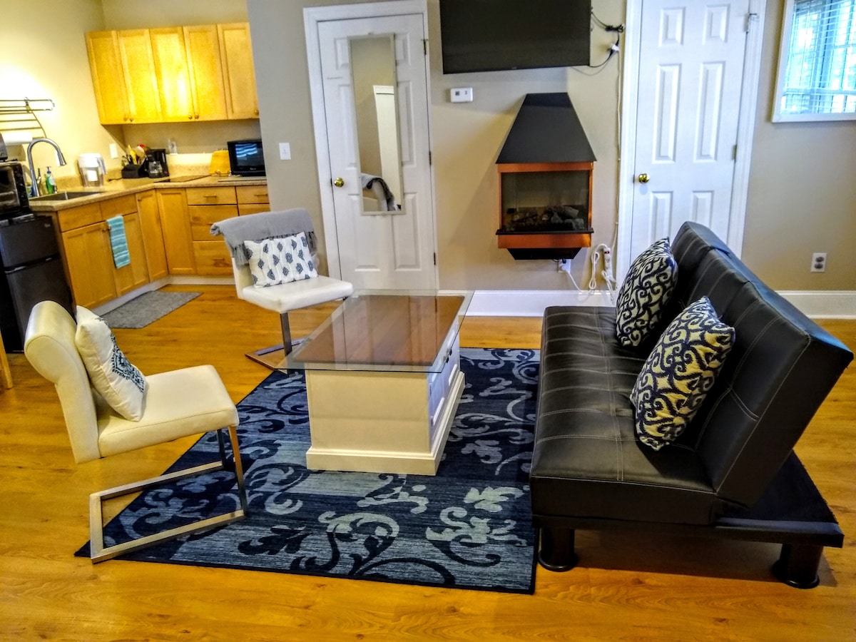 Loftet er et studio-gjestehus i sentrum av Greensboro. Gjennomført møblert, komfortabel og plettfri ren og desinfisert leilighet i hjertet av sentrum. Mye lys og privat. Den elektriske peisen øker den koselige følelsen. Enkel, uavhengig innsjekking/utsjekking med elektronisk lås. Dette er en studioleilighet med to senger – en queensize Murphy-seng og en fullstørrelses futon-seng. Den passer best for enslige, par eller personer som føler seg komfortable med å sove på samme sted.