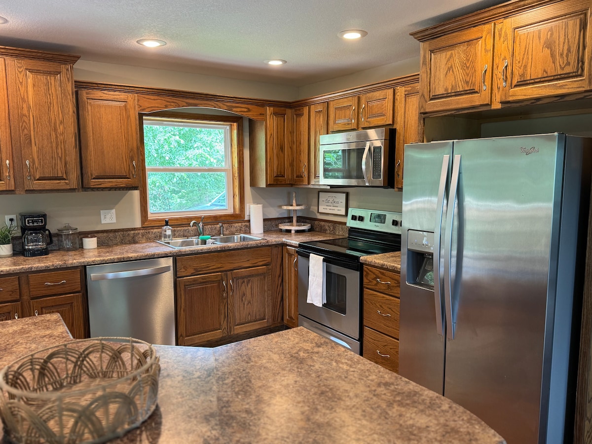 Stedet Rustikk sjarm møter den rolige skjønnheten i Ozarks i disse magiske omgivelsene med utsikt over gården vår, og tilbyr et perfekt tilfluktssted for hvile eller en base for ditt neste eventyr. På innsiden finner du et koselig oppholdssted dekorert med moderne bondegårdssjarm, komplett med en varm elektrisk peis. Slapp av på det komfortable soverommet med kingsize-seng etter en dag med utforskning. Hytta har også et velutstyrt bad og et funksjonelt kjøkken for deg.