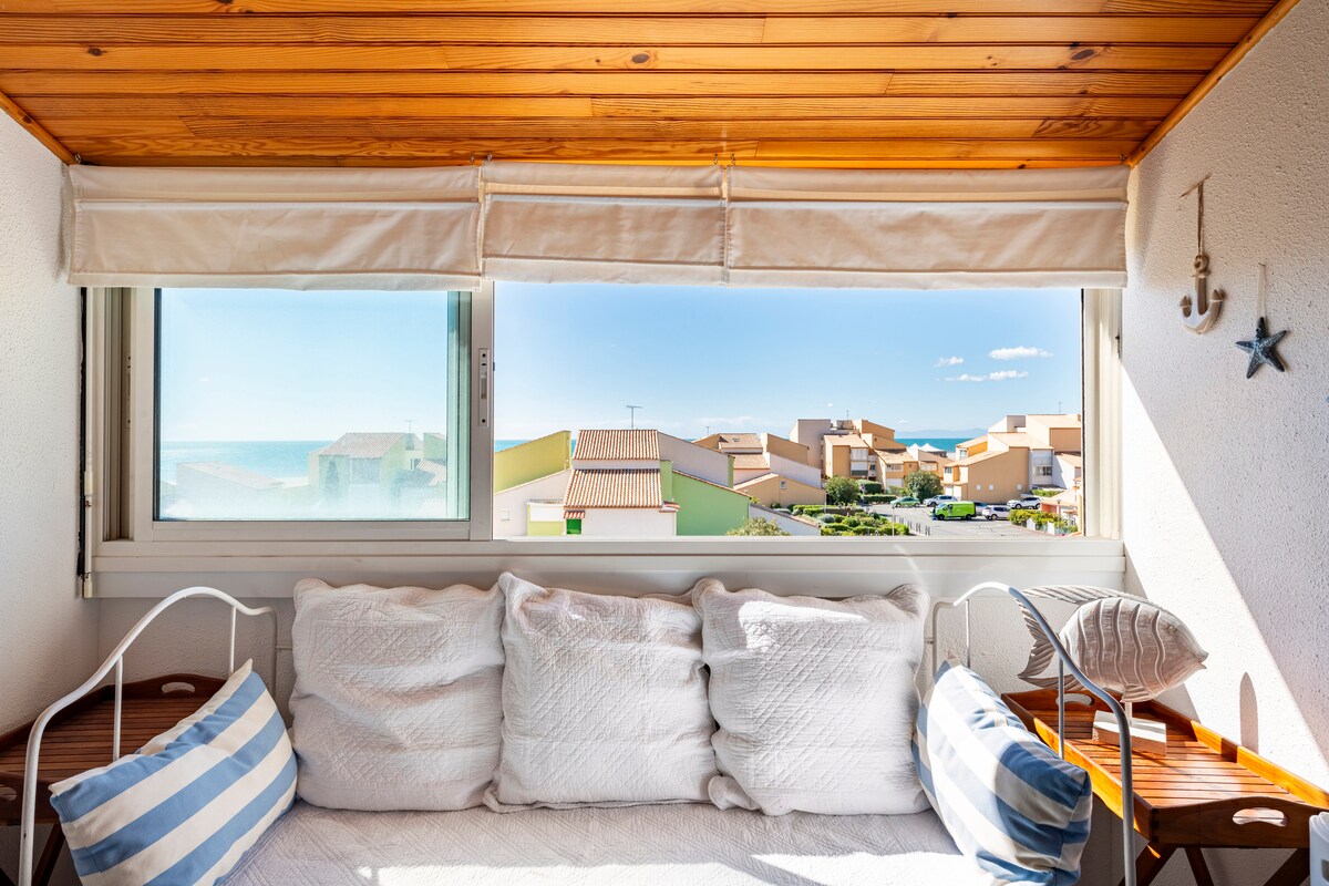 Studio (NEDRE mesanin) 35 m2 Fire personer (to + to). Sikker bolig i andre etasje. Utstyrt terrasse. Uhindret utsikt. Gratis parkering 137 plasser 50 meter unna (kameraer) Petanque-bane. – 100 meter langt strandkasino langs havet. – I nærheten av fasiliteter, restauranter/kasino, spill/butikker (Carrefour-markedet ligger 50 meter unna). 800 meter i sentrum. - 100 meter buss Beziers Villages omgivelser. – Patio Arboré Rack Vélo – Wi-Fi/Netflix -1 soverom mesanin LAV seng 140 – 1 BZ 140 sovesofa Dusjtoaletter Sykkelsti under bolig