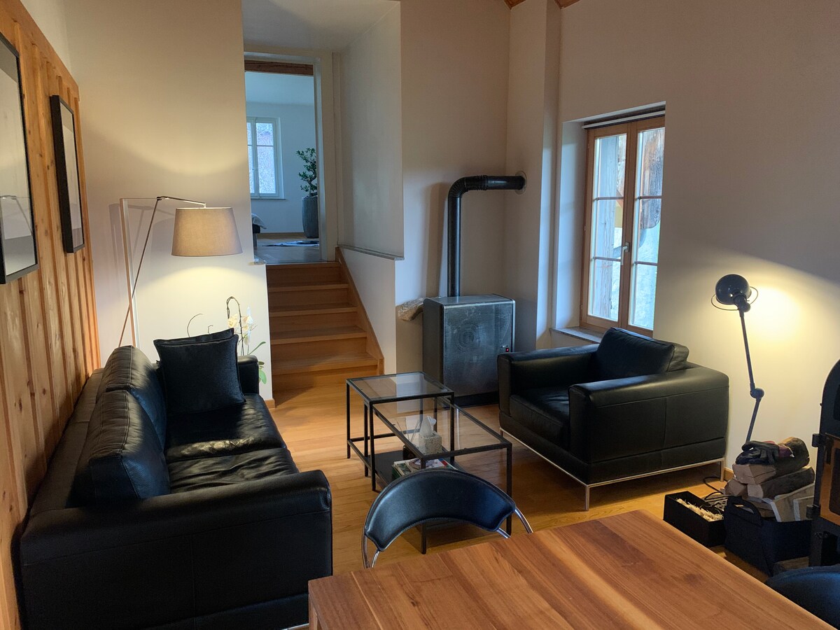 Vertene Sandra og Noël ønsker deg hjertelig velkommen til det nyoppussede loftsleiligheten i Im Fang! Det koselige gjesterommet ligger i en tidligere militær brakke, er på 52 kvm og har en dobbeltseng samt en komfortabel sofa som kan brukes til ekstra gjester ved behov. Har du ikke lyst til å lage mat? Ikke noe problem - vi elsker det!! Og vi vil gjerne skjemme deg bort med lokale delikatesser eller en fin gourmetmeny! Vårt motto: Ditt hjem hjemmefra