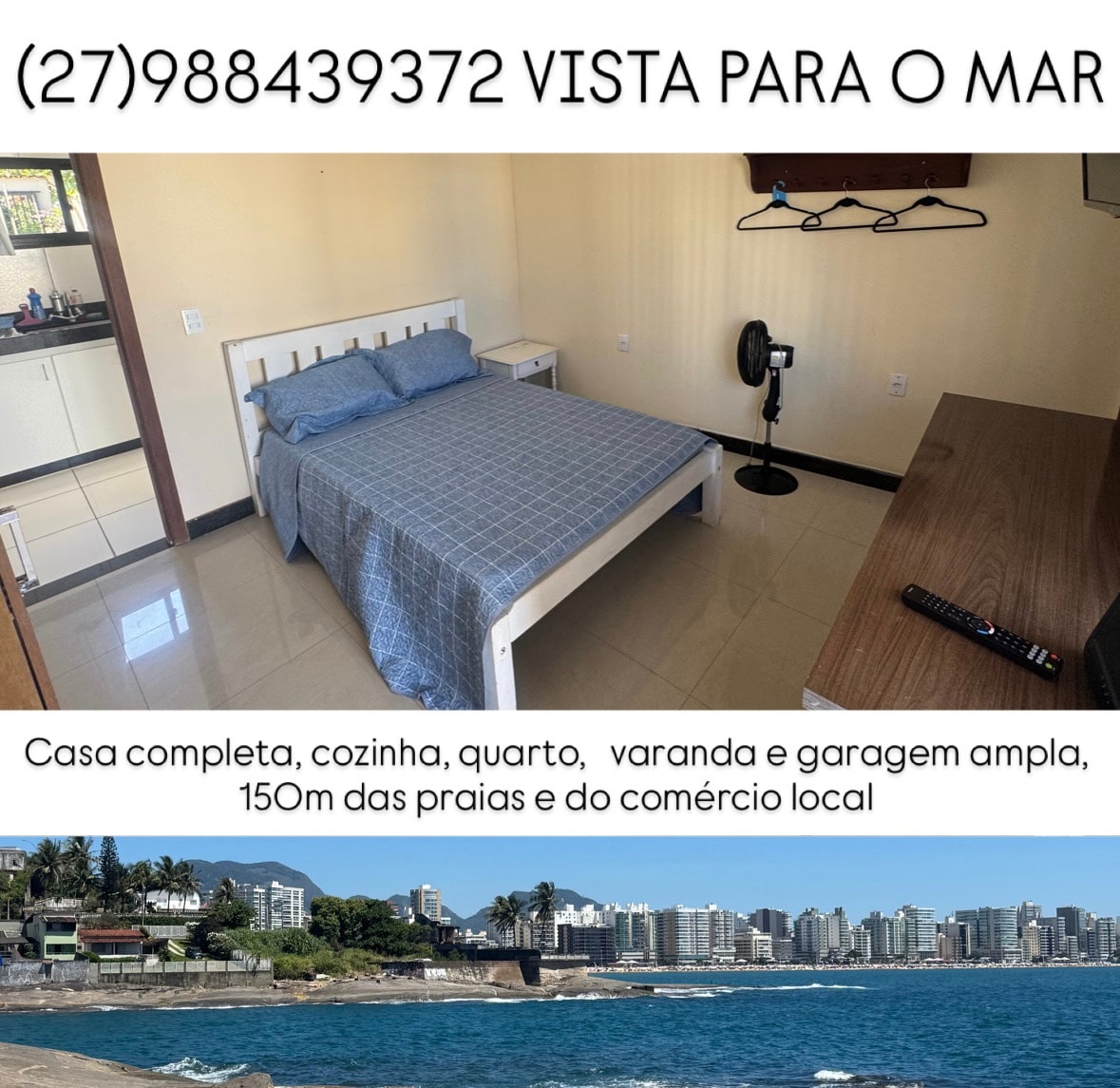 Kjæledyr er IKKE tillatt. Fester og arrangementer er IKKE tillatt. Hus med utsikt over havet (på stranden) i Cond. Village da Praia – Guarapari – ES – mellom de tre strendene og Cond. Aldeia da Praia. Høy standard, fire store suiter, alle med aircondition, kingsize-seng og enkeltsenger. Tre suiter i øverste etasje, med hovedsuiten med utsikt over havet, og en suite i første etasje (tilrettelagt for eldre). Komplett kjøkken, toalett, roterende grill med bord og stoler, garasje for 4 biler