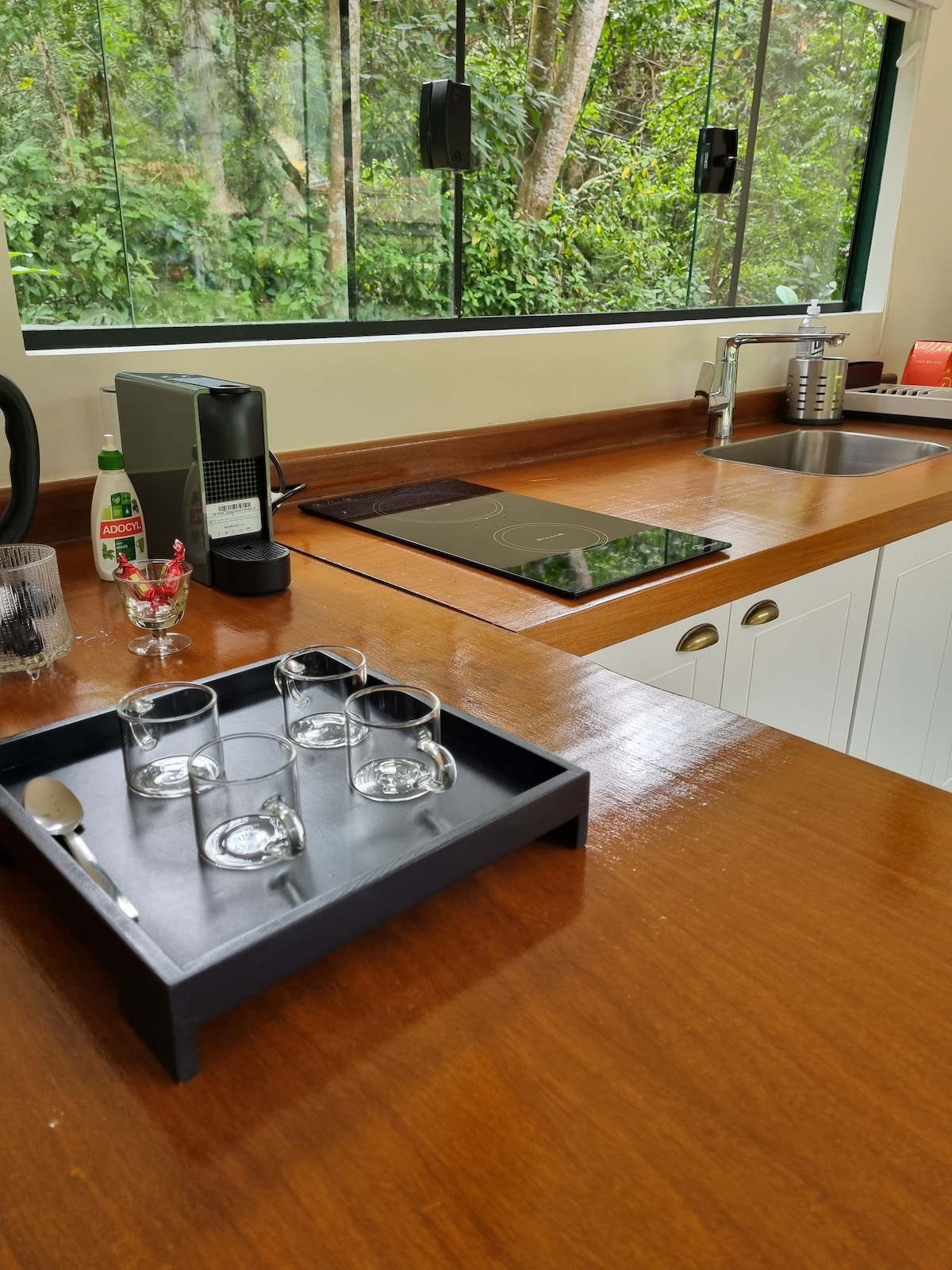 Casa da Ponte har et utendørs badekar for seks personer, og tilbyr direkte kontakt med naturen, med glassvegger og tak, slik at du kan ha det grønne inne i huset med stor sikkerhet og komfort. Våkne opp med morgenduggen og lyset som kommer inn gjennom den gigantiske glassveggen, mens du lytter til og ser på dyrene i den atlantiske skogen, som om du sov under et tre, men i en kingsize-seng med en varm dyne og peisen som varmer opp rommet. Kom og opplev denne følelsen.