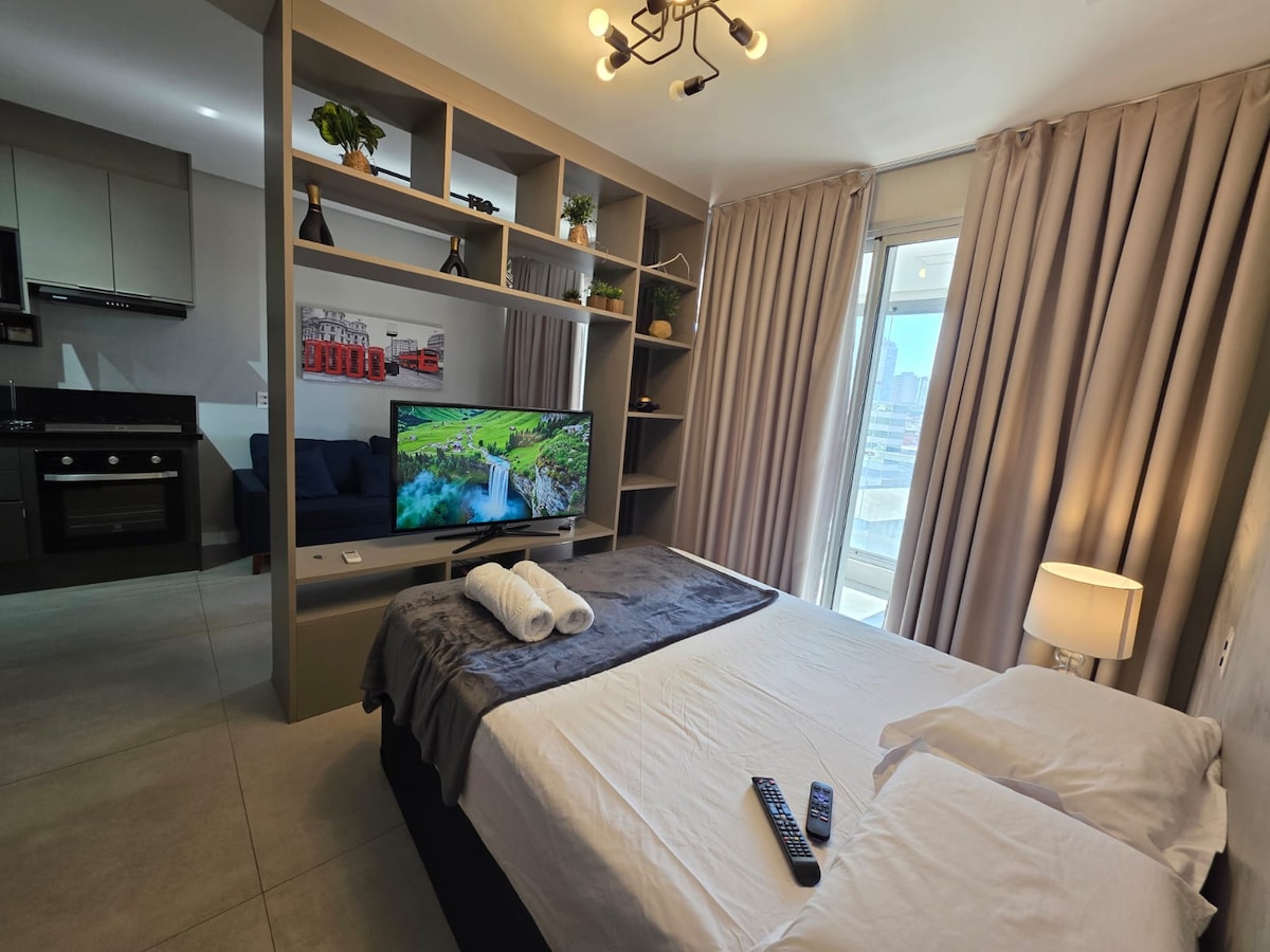Komplett studio med balkong, kjøkken med redskaper, toalett, skap, kjøleskap, 55" smart-TV, vifte, dampstrykejern, tørketrommel, standard dobbeltseng 1,88 x 1,38 og trådløst nettverk. Vi har parkeringsplass (ikke inkludert - gebyr for del) og utendørs røykeområde. Sengetøy og håndklær er tilgjengelig. BELIGGENHET - i nærheten av den internasjonale flyplassen og togstasjonen, butikker som apotek, butikker, markeder, restauranter, banker, SESC Guarulhos osv.