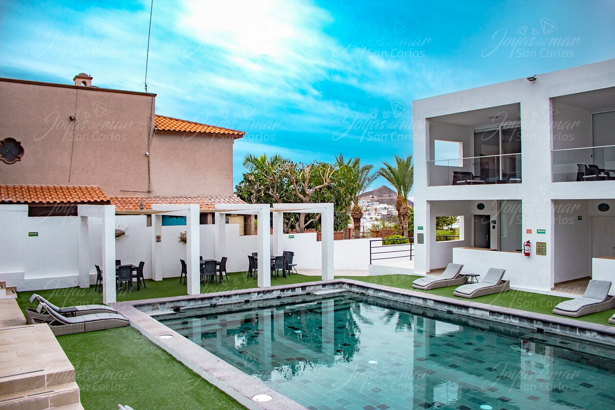 Spacious 2BR apartment in San Carlos, Sonora, just minutes walking to the beach, marina, restaurants and bars. Ideal for 4–6 guests, with 2 bedrooms, 3 double beds, full bathroom, equipped kitchen and living area. Enjoy a beautiful terrace with jacuzzi, outdoor dining and sunset views. Private parking and independent entrance. A perfect blend of comfort, location and elevated coastal living🫶🏻🌴