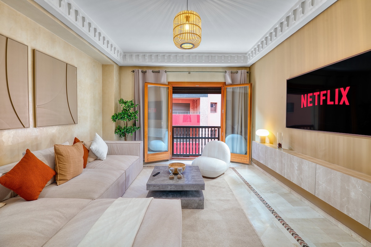 ✨ Leilighet i høy klasse med terrasse, parkering og klimaanlegg🥶 – Marrakech sentrum ✨ Unn deg selv et førsteklasses opphold i denne moderne, fullt klimatiserte kokongen i hjertet av Marrakech. Denne raffinerte boligen er designet for å kombinere moderne design, absolutt komfort og eksklusive fasiliteter: privat terrasse, sikker parkering, sengetøy av hotellkvalitet … Perfekt plassert, garanterer det en unik, rolig og elegant opplevelse, nær de vakreste stedene i byen.