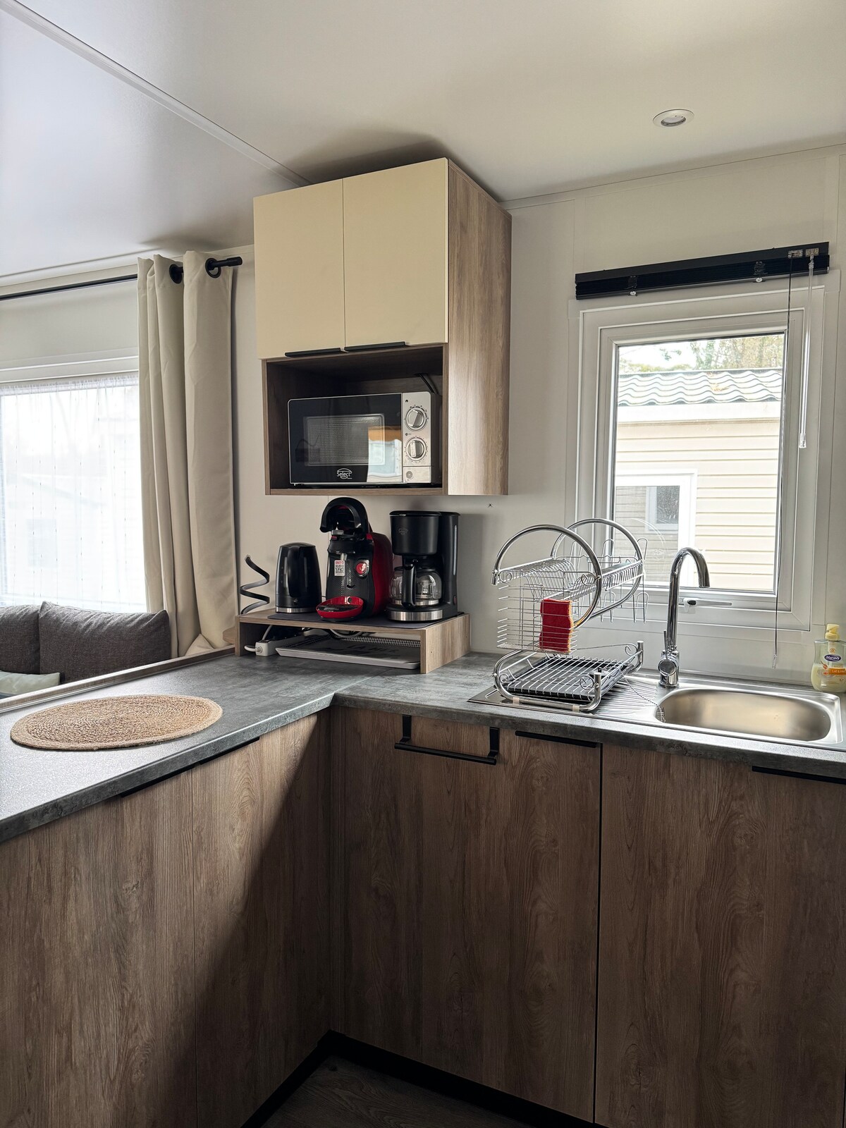 Nylig fullt utstyrt Mobil 'Home på en 4-stjerners campingplass bare et steinkast fra havet.. du vil elske det! Eiendommen har en romslig stue og rikelig med lagringsplass på hvert av de tre soverommene. Kjøkkenet er fullt utstyrt (tallerkener, kaffetrakter, brødrister, stekeovn, gasskomfyr 4 branner..). Badet er atskilt fra toalettet. Den halvdekkede terrassen tilbyr deg et ekstra oppholdsrom hvor du kan spise lunsj med familien din eller solbade. Nyt ferien !
