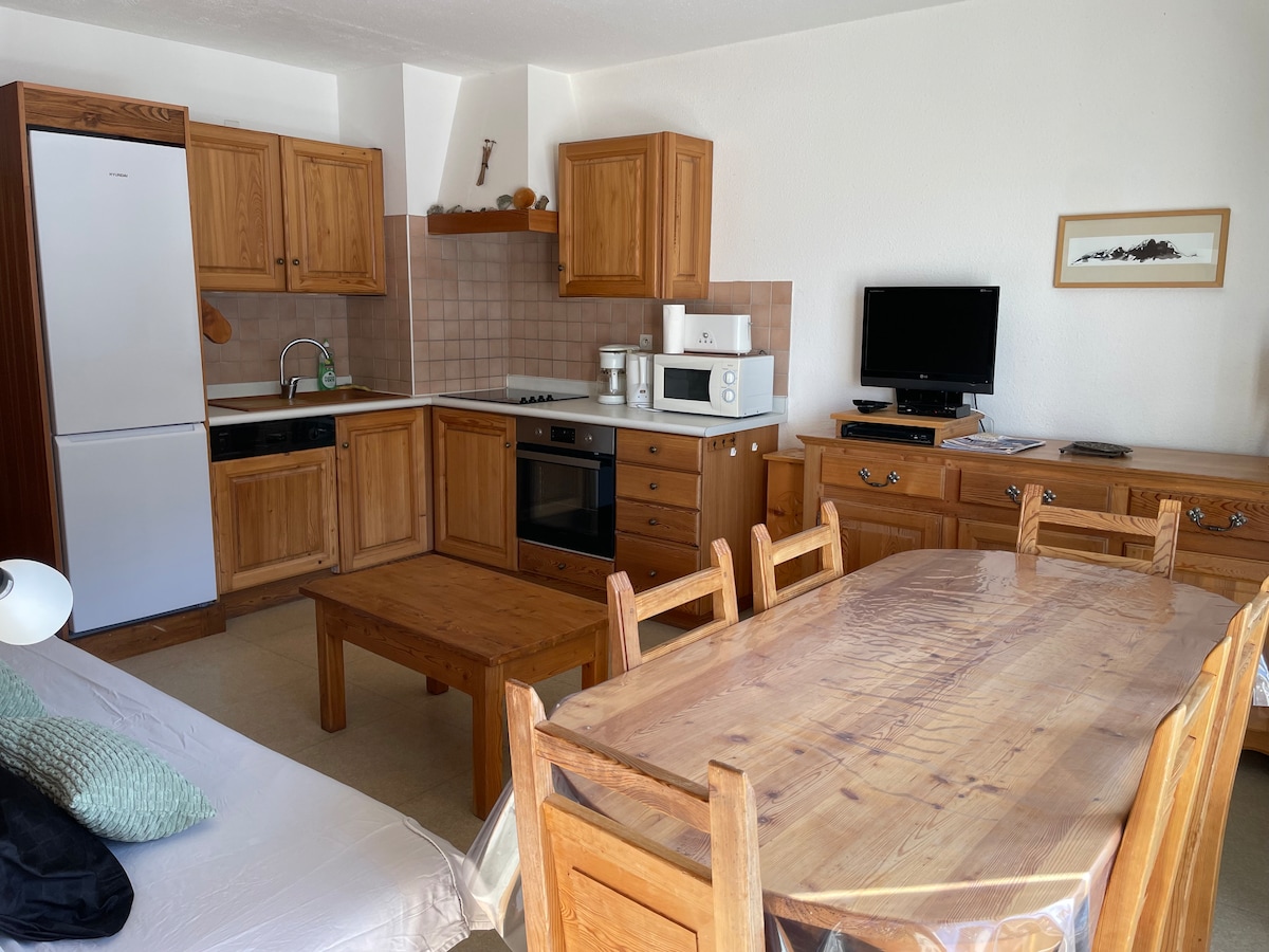 Vi tilbyr en leilighet på 30 m2, nylig renovert, med en balkong vendt sørover. Ved ankomst vil du finne sengene redde og håndklær. Ideelt plassert for ski, fotturer og nær butikker. 200 m fra svømmebassenget. Kjøkkenet er utstyrt med oppvaskmaskin, ovn, mikrobølgeovn, kaffemaskin av typen "nespresso", racletteovn.