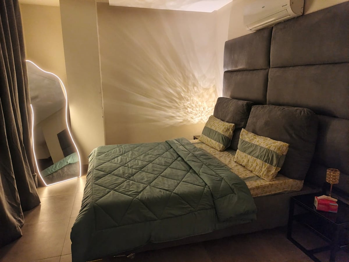 ★ Ligger i PENTASQUARE DHA FASE 5 Luksusleilighet med ★ 1 soverom ★ Luksusstue med sovesofa ★ SAMSUNG QLED-TV ★ Ett soverom med kingsize-seng ★ 1,5 bad med moderne innredning ★ 5 minutters kjøretur til Dolmen Mall. ★ Hage vendt mot leiligheten ★ Innsjekking med smartlås ★ Dagligvarer og kafeer i bygningen Oppvarming og kjøling ★ døgnet rundt (sentralt) ★ Fullt utstyrt kjøkken. ★ Gratis madrasser ★ Gratis parkering. ★ 5G Internet Power Backup ★ døgnet rundt ★ Rent sengetøy - gratis toalettartikler Sikkerhet og resepsjon døgnet ★ rundt