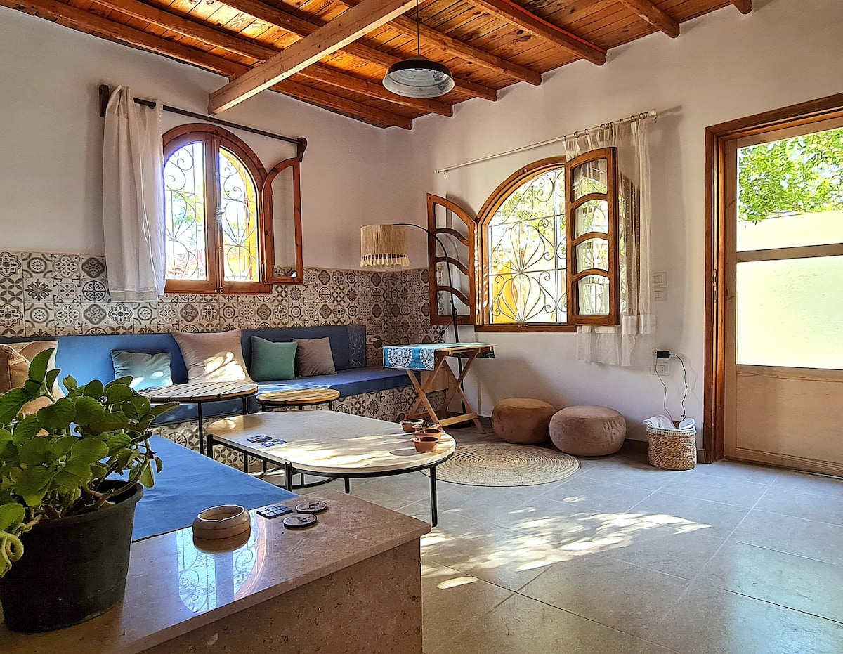En hytte i bohemsk stil i Dahab, med havutsikt i Eel garden og bare noen få skritt unna Coral Coast. Den har to koselige soverom, et åpent og stilig resepsjonsområde og et nydelig tak med fantastisk utsikt over sjøen. Interiøret er utformet med en varm, bohemsk stemning, som gjenspeiler en rolig og avslappende atmosfære, med naturlig innredning og jordnære toner. Det er det perfekte stedet å slappe av og nyte skjønnheten i havet og naturen.