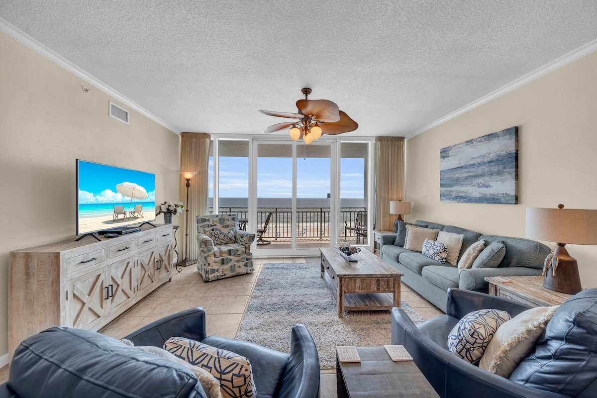 To soverom + køyeseng ~ Strandutsikt, plass til åtte! • Fantastisk direkte utsikt over golfens hvite sandstrender. • Master King Suite med boblebad, masterbad, andre Queen Bedroom, Bunk Room. • Balkong 8' x 24' over hele enheten komplett med komfortable utemøbler – perfekt for å se på stranden. • SMART flatskjerm-TV, nytt flisgulv, vaskemaskin og tørketrommel i full størrelse. • Strandutsikt, gangavstand til restauranter og uteliv. • Parker i samme etasje som enheten. • Parkering på stedet.