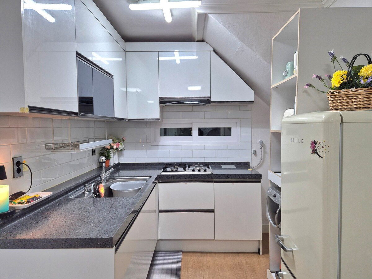 Dette er «Stay Yellow» som ligger i superstasjonsområdet, fire minutters gange fra Hyeonchungro stasjon. Overnattingsstedet vårt har plass til opptil seks personer. Vi har dekorert det med varme følelser, slik at du kan dra med gode minner med familie, venner og kjære. Spesielt er utsiden av bygningen malt i en varm gul farge, og interiøret er dekorert i en hvit tone for å understreke hygge og ryddighet. Innsjekking: 15:00 / Utsjekking: 11:00 Det er en gratis parkeringsplass i nærheten av eiendommen. Uavhengig bruk av andre etasje i bygningen, to soverom, ett kjøkken (selvbetjening, frokost-cup ramen inkludert), varmt vann og oppvarming (bygass), trådløst nettverk med høy hastighet, Netflix. Velkommen til Stay Norang, som ligger bare fire minutters gange fra Hyeonchungno-stasjonen. Det koselige gjestehuset vårt har plass til opptil seks personer, noe som gjør det perfekt for familier, venner eller par.