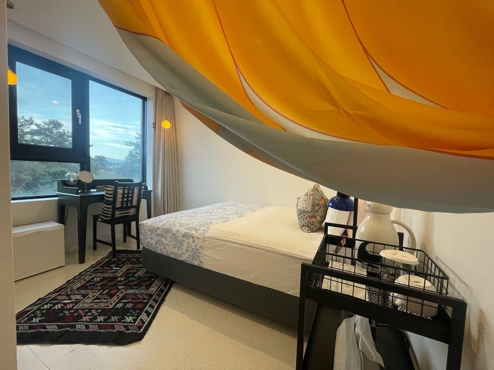 Et ryddig og følsomt overnattingssted med en rolig landlig utsikt. Dobbelrom med utsikt over Osan-garden.