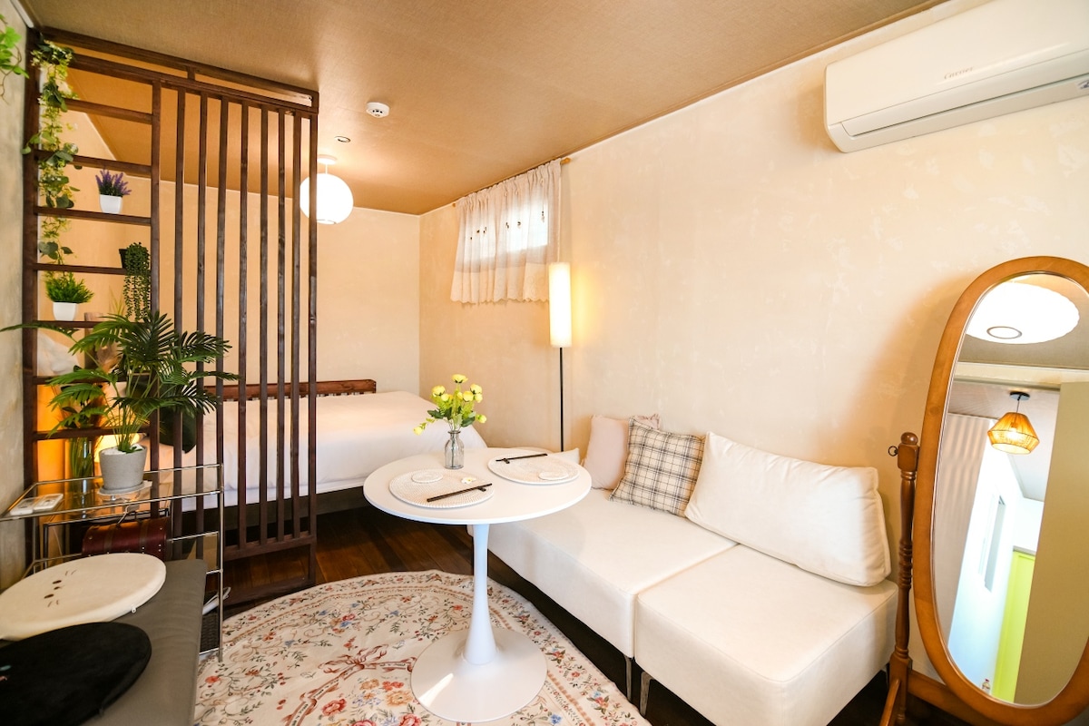Det ligger ved utgang 6 på Hongdae stasjon på Incheon lufthavn T-banestasjon, og det er en park, en kafé, mange butikker og fasiliteter i nærheten, og det er tre T-banelinjer, så transporten er praktisk. Selv om det er tre rom, kan du nyte en rolig tur fordi vi kun tar imot ett team.