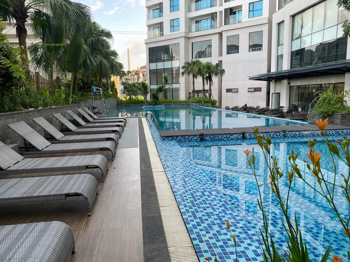 Hvis du ser etter en livlig og sentral beliggenhet, er dette kanskje ikke ideelt: Leiligheten ligger 5 km unna sentrum i turistområdet Bãi Cháy og 12 km unna sentrum i Hạ Long, med begrensede fasiliteter i nærheten og sporadiske, korte strømbrudd i den varme årstiden. Men hvis du setter pris på ro og frisk sjøluft, er dette et perfekt valg: rett ved kysten, i nærheten av cruisehavner, i en moderne bygning med basseng, treningssenter, spa og restaurant (mot et ekstra gebyr). Leiligheten er ren og elegant, og jeg ønsker deg velkommen med varme og omsorg.