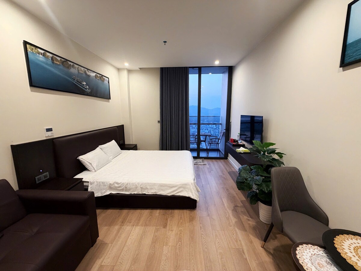 🏖️ Våkn opp til fantastisk HAVUTSIKT i hjertet av Ha Long! Slapp av i mitt romslige studio på 45 kvm med havutsikt på det femstjerners À La Carte Ha Long Bay Hotel & Residence, med et varmt og elegant snev av luksus.