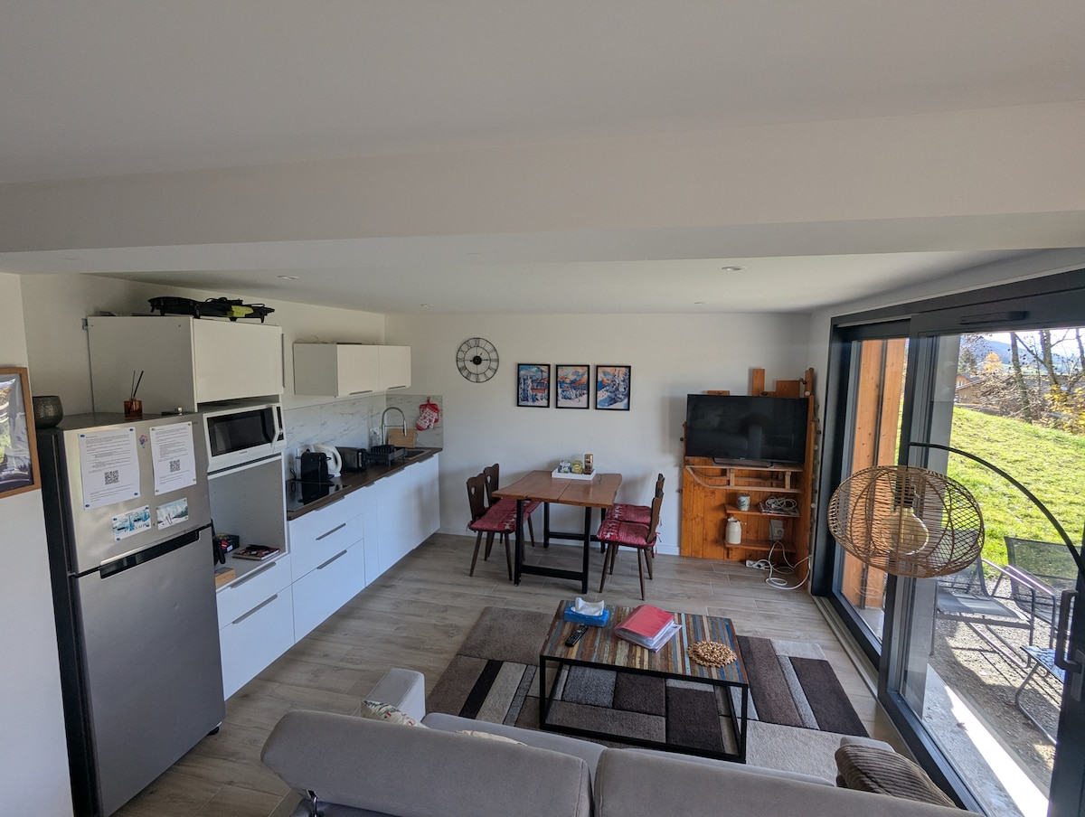Koselig ⛰️ leilighet i første etasje i en hytte, 1000 meter over havet og 500 meter fra bakkene. ❄️ Ideelt for skigåing, turgåing eller en tur til Genèvesjøen (25 minutter). Utstyrt 🍳 kjøkken: induksjon, plancha, air-fryer, raclette- og fondueapparater. Vi sørger for 🛏️ sengetøy og håndklær. Privat 🅿️ parkering med 7 kWh-terminal, garasje for motorsykkelvenner. 🐶 Kjæledyr er velkomne. 🌲 Stille, utsikt mot fjellet, restauranter og butikker innenfor gangavstand.