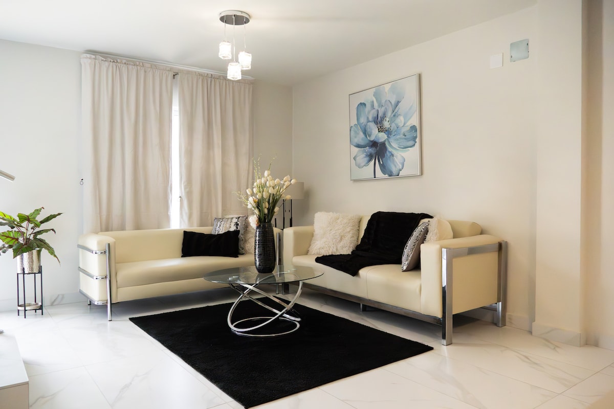 Denne enheten har en unik stil. Det er helt svart, noe som gjør det perfekt til å slappe av, og binging på dine favorittfilmer/serier. Madrass i king-size-seng og 75" TV *Klimaanlegg/varmeapparat *Rask trådløst nettverk. *Alt på bildene er helt PRIVAT. Nyt den vakre solnedgangen fra vårt badekar for to personer og terrassen (områdets beste utsikt!)🌅 Utekjøkken🍳/ Stue med bålpanne og kino! 🎥 Ligger inne i et inngjerdet boligområde (24/7 sikkerhet) Gangavstand til lokale barer, restauranter og MalibuBeach (ca.1 km).