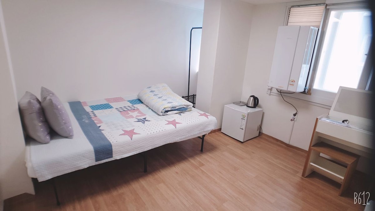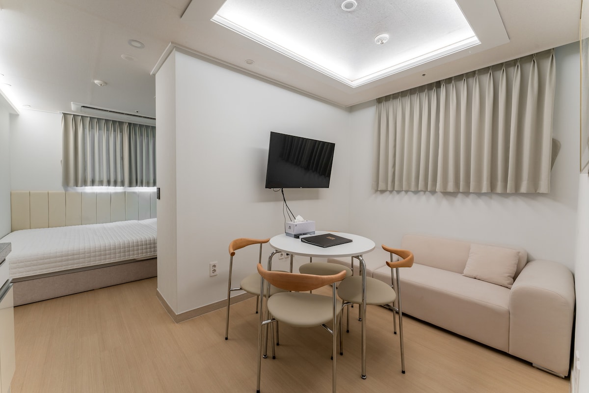 – Rett foran Jagalchi stasjon. Det ligger rett foran en restaurant og en nærbutikk. Det er veldig rent med det fineste interiøret. – Det er en seng, sengetøy, bestikk, TV (Netflix tilgjengelig). - dobbeltseng (seng for to personer) – Kapselkaffe er inkludert. – Dette er kontaktløs innsjekking og utsjekking. - Det er tørketrommel, krølltang, sjampo, balsam, tannbørste, tannkrem og lotion. – Vannrenser. Is i fryseren. - Bruk den offentlige parkeringsplassen foran til parkering. Parkeringsgebyr betales (10 000 won per dag) – Gi oss beskjed på forhånd om tidlig innsjekking og sen utsjekking (ekstra kostnad påløper). - Bagasjeoppbevaring tilgjengelig. Gi meg beskjed på forhånd når du oppbevarer bagasje.