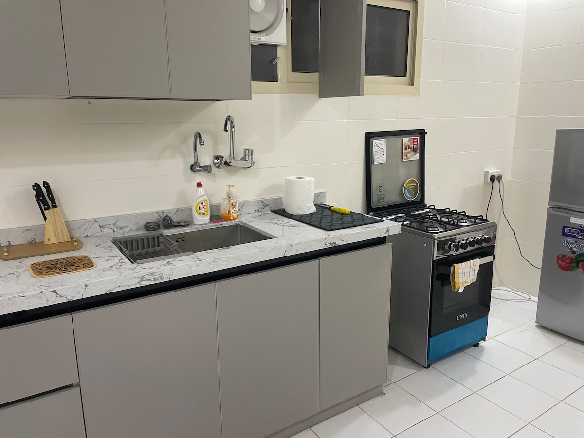 Romslig og elegant leilighet for ikke-røykere med smart inngang og en unik beliggenhet nær restauranter og kafeer (Starbucks, Loft, Al Baik..) Leiligheten har en stue, spisestue, to store soverom, kjøkken og en rolig uteplass for friluftsliv. Kjøkkenet er elegant designet for å dekke dine behov og er utstyrt med en ovn, kjøleskap, kjøkkenutstyr og en kaffekrok. Kaffehjørnet inkluderer en kaffemaskin og flere typer kaffe og te, inkludert arabisk kaffe. Stuen har en 60-tommers smart-TV som inneholder alle sports- og underholdningsplattformer, se VIP-sport, Netflix