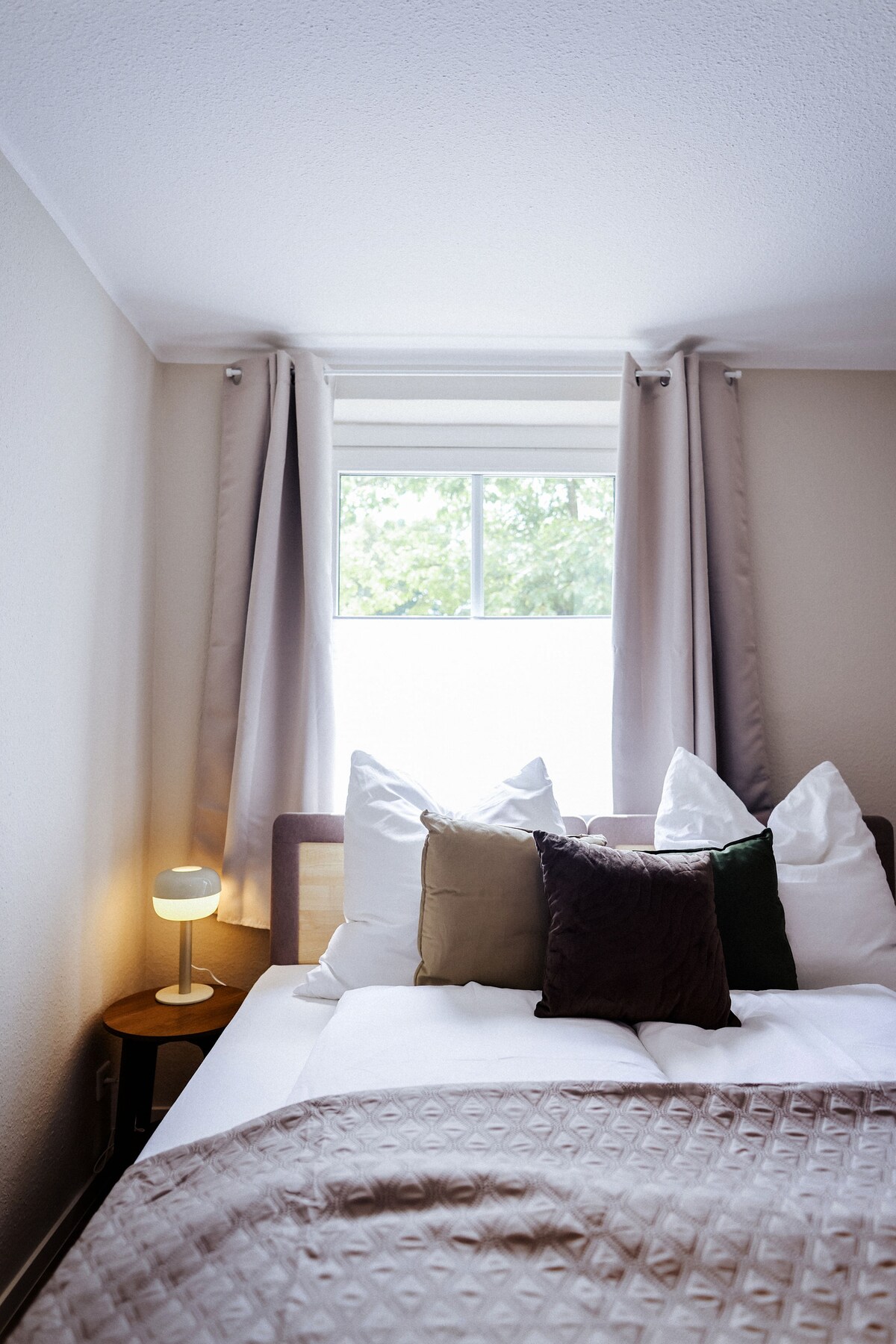 Enjoy a wonderful stay in our apartment. Relax in a cozy atmosphere or work with a view of the beautiful chestnut tree. Spend great evenings cooking or relax in the bathtub with a view of the starry sky. A bedroom with a double bed (1.40m) and a sofa bed (1.40m) as well as a sofa bed (1.30m) in the living room offer the opportunity to stay overnight for up to 5 people. To get to the apartment you can easily take the elevator ☺️