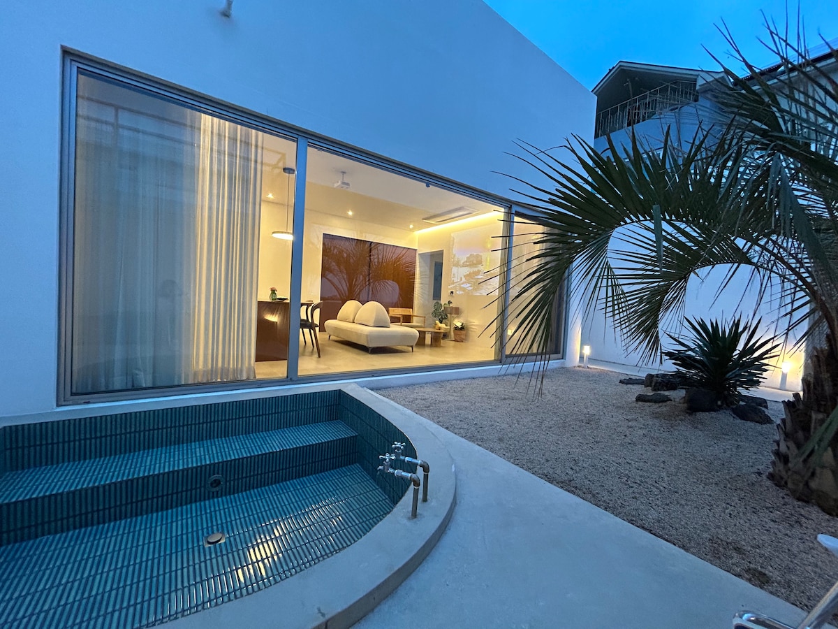 ▶Jeju Sum åpningsfest rabatt ◀ 1. Opptil 55 % ~ 20 % prisrabatt. 2. Gratis lading av elbil for mer enn 2 netter.!!! Et fredelig opphold på "Jeju Sum", som ligger skjult foran havet Prøv å slappe av på et rolig, men stilig sted. Det er det fjerde verket til "Design Noeul". Uansett hvor du står inne, er du koblet til havet uten forstyrrelser. Jacuzzi-temperaturen på 35 grader foran sjøen smelter vekk trøttheten. En dag når det snør, kan du føle varmen du kan oppleve i et utendørs bad. Og på våren, sommeren og høsten kan du nyte et kveldsmat eller en helbredende kaffestund med føttene i et kjølig fotbad (kald dam). Det er optimalisert for to par, eller en familie på fire. Hvis du er i "Jeju Sum", vil du ikke ha nok tid til å nyte det bare innendørs. Vi anbefaler på det sterkeste at du blir i to netter eller mer.