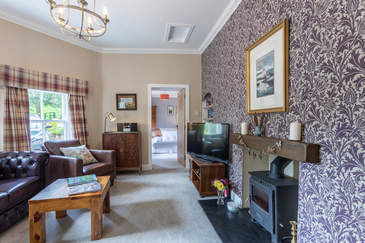 BELIGGENHET: 6 minutter fra M74/M8. Alle priser er inklusive Airbnbs tjenestegebyr på 15 % Kun for voksne Orchard Apartment er en nybygd, frittstående 5-stjerners superior-leilighet med ett soverom på et eksklusivt, privat eiendom i det svært ettertraktede Mauldslie Castle Orchard i Clyde-dalen. Mauldslie Castle har tatt imot kong George V og dronning Mary i 1914, og sir Winston Churchills kone, Clementine, var også en fast gjest. Faren hennes, oberst Sir Henry Hozier, bror til den første Lord Newlands, Mauldslie