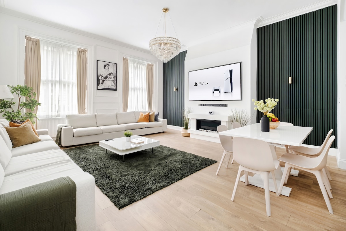 Denne sofistikerte leiligheten ligger i ♥️ av Marylebone og har høye tak og en spektakulær 90-tommers TV, perfekt for koselige filmkvelder. Bare noen minutter fra Marylebone High Street, kåret til Londons beste og vakreste hovedgate fem år på rad, med elegante butikker og kaféer rett utenfor døren din. Med to soverom, tre komplette bad, en stue og et kjøkken med åpen planløsning, og en privat hage med sitteplasser og grillutstyr. En virkelig stilfull base i London.