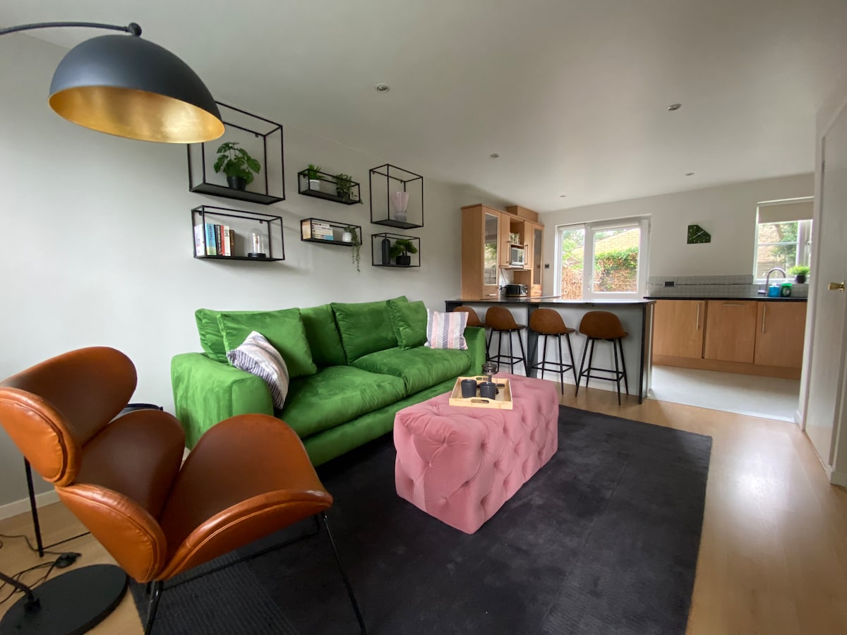 Slapp av på dette moderne, rolige, elegante stedet, et nytt tillegg som er en integrert del av familiehjemmet vårt. Parkering på veien. Stuen har en veldig komfortabel sovesofa. Vi ligger 12 minutters gange fra Sunbury Main Line togstasjon med tog direkte til London, eller en kort busstur til Feltham stasjon med hurtigtog til London Waterloo. I nærheten av Heathrow lufthavn, Kew Gardens, Hampton Court, Twickenham, BP village. Ti minutters gange fra landsbyen med gode puber og restauranter. Gangavstand til Kempton Park.