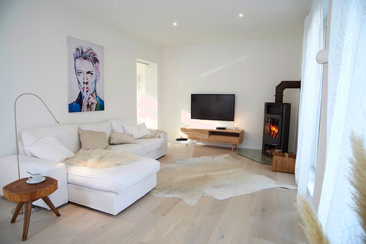 Fin 80 kvm leilighet i første etasje, helt nybygget i 2018, med badstue, bakgård, peis, bad med badekar og stor dusj og fullt utstyrt kjøkken. Veldig sentralt, to minutter til T-banen, fem minutter til alle restauranter/kjøpesentre og den vakre historiske byen Oberursel, ti minutter langs Urselbach (liten bekk) til svømmehallen. Frankfurt/M. 10 minutter med bil eller 20 minutter med T-bane. Oberursel ligger direkte ved Großer Feldberg med mange utfluktsmuligheter.