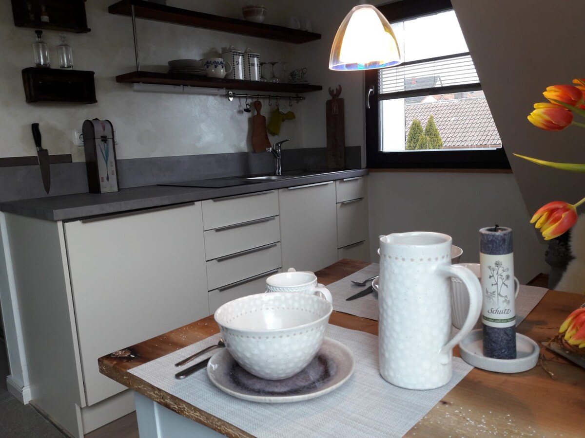 Velkommen til ditt midlertidige hjem! Den lyse loftsleiligheten vår med stor balkong kombinerer komfort og moderne design. Enten det er ferie eller jobbreise, kan du føle deg hjemme her med en gang. Det moderne kjøkkenet inviterer dere til å lage mat sammen, balkongen til kaffe, sol og avslapning. Moro for alle aldersgrupper venter ved fotballbordet. Åpne områder, mye lys og en koselig atmosfære gjør leiligheten spesiell. Den har plass til opptil fire voksne og ett lite barn.