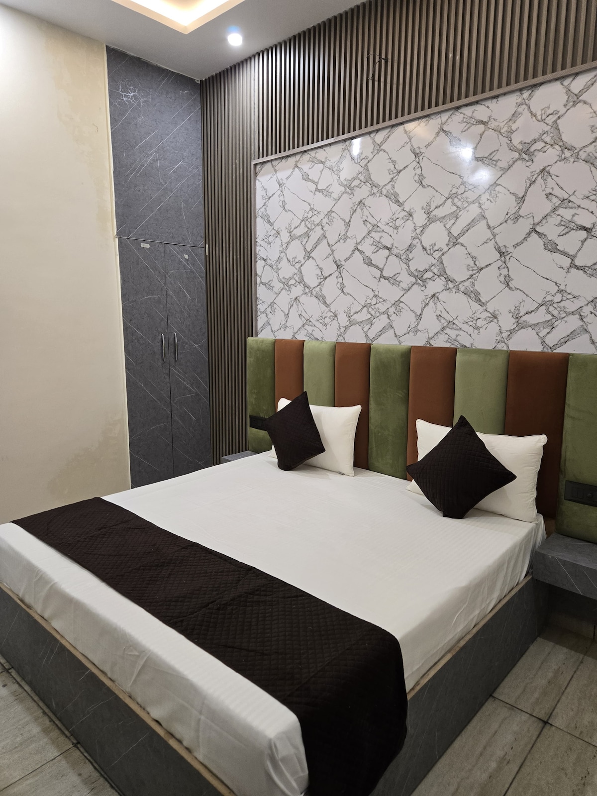**Deluxe King-rom | Rent og komfortabelt** Et komfortabelt deluxe-rom med en dobbeltseng i king size-størrelse, klimaanlegg og et tilstøtende privat bad. Egnet for par eller små familier, med en ekstra gulvmadrass tilgjengelig på forespørsel for en ekstra gjest. Inkluderer trådløst nettverk med høy hastighet, daglig rengjøring, strømforsyning og tilgang til fellesområder. Ideell for reisende som ønsker et rent, rolig og praktisk opphold i Haridwar.