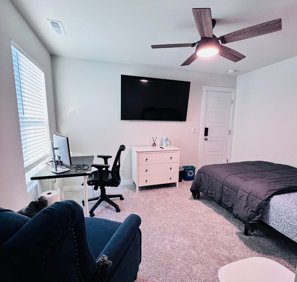 My space is very roomy and comfortable with blinds and entry door that brings in a lot of light. It is the entire lower floor that includes a patio for outdoor relaxation. The patio is shaded in the evening, and you can enjoy your coffee while the sun rises behind the trees in the morning. Beautiful landscape and vegetable garden to view along with the wall of trees at the back. ROKU TV. Netflix for entertainment. Kitchen appliances for basic needs.